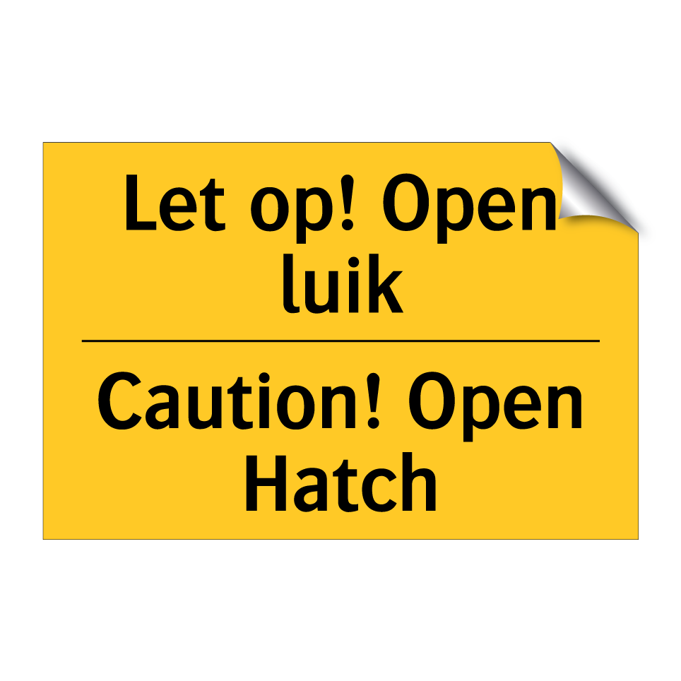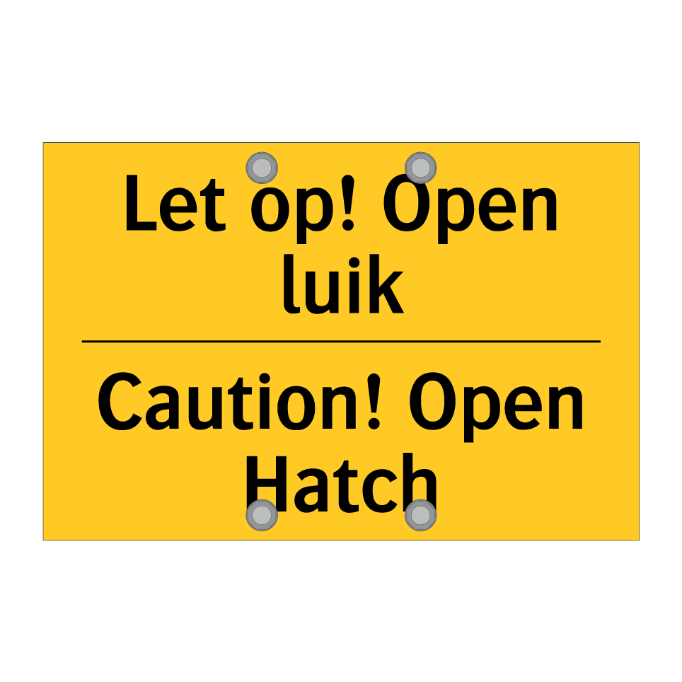 Waarschuwingsbord met de tekst Let op! Open luik / Caution! Open Hatch