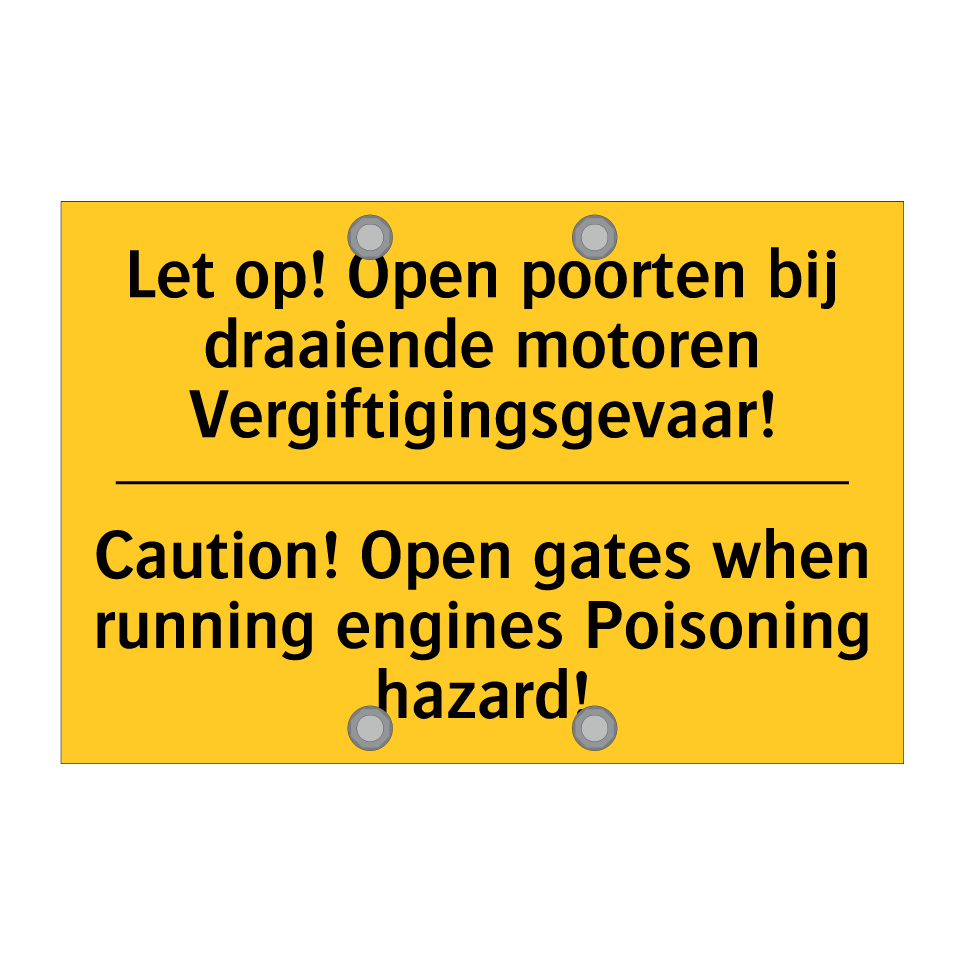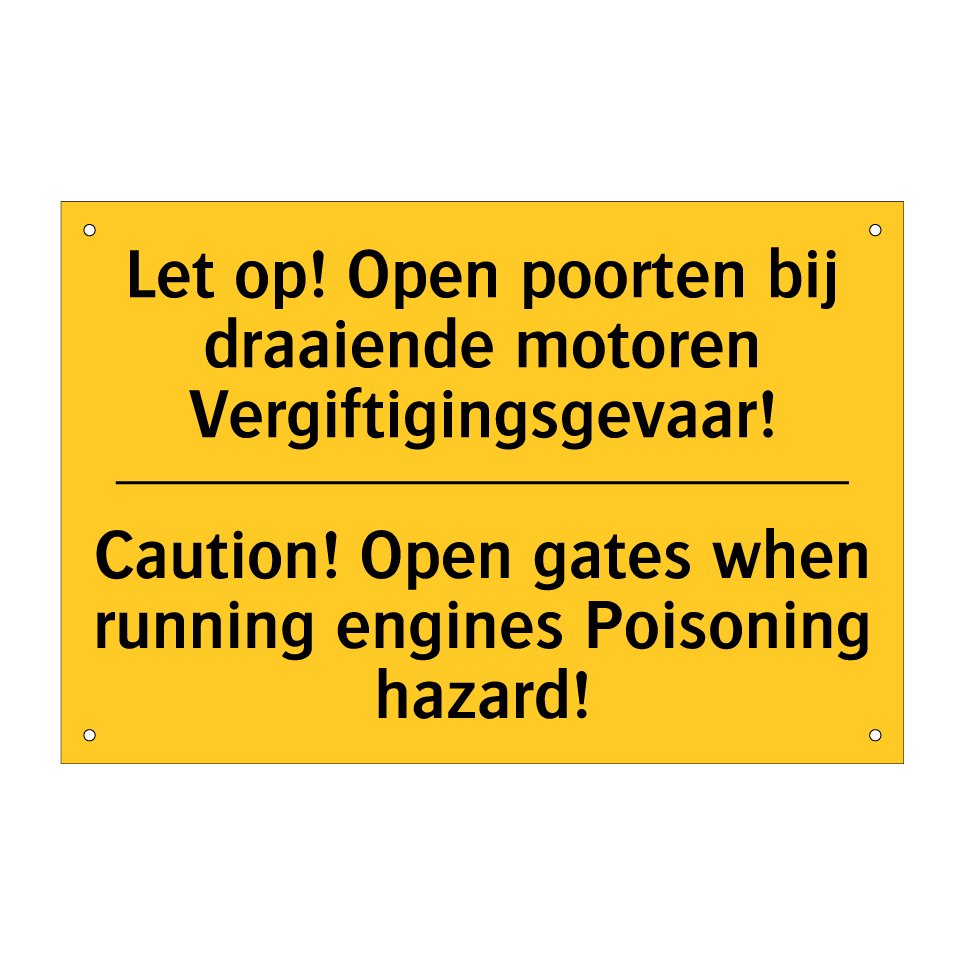 Waarschuwingsbord met de tekst Let op! Open poorten bij draaiende motoren Vergiftigingsgevaar! / Caution! Open gates when running engines Poisoning hazard!