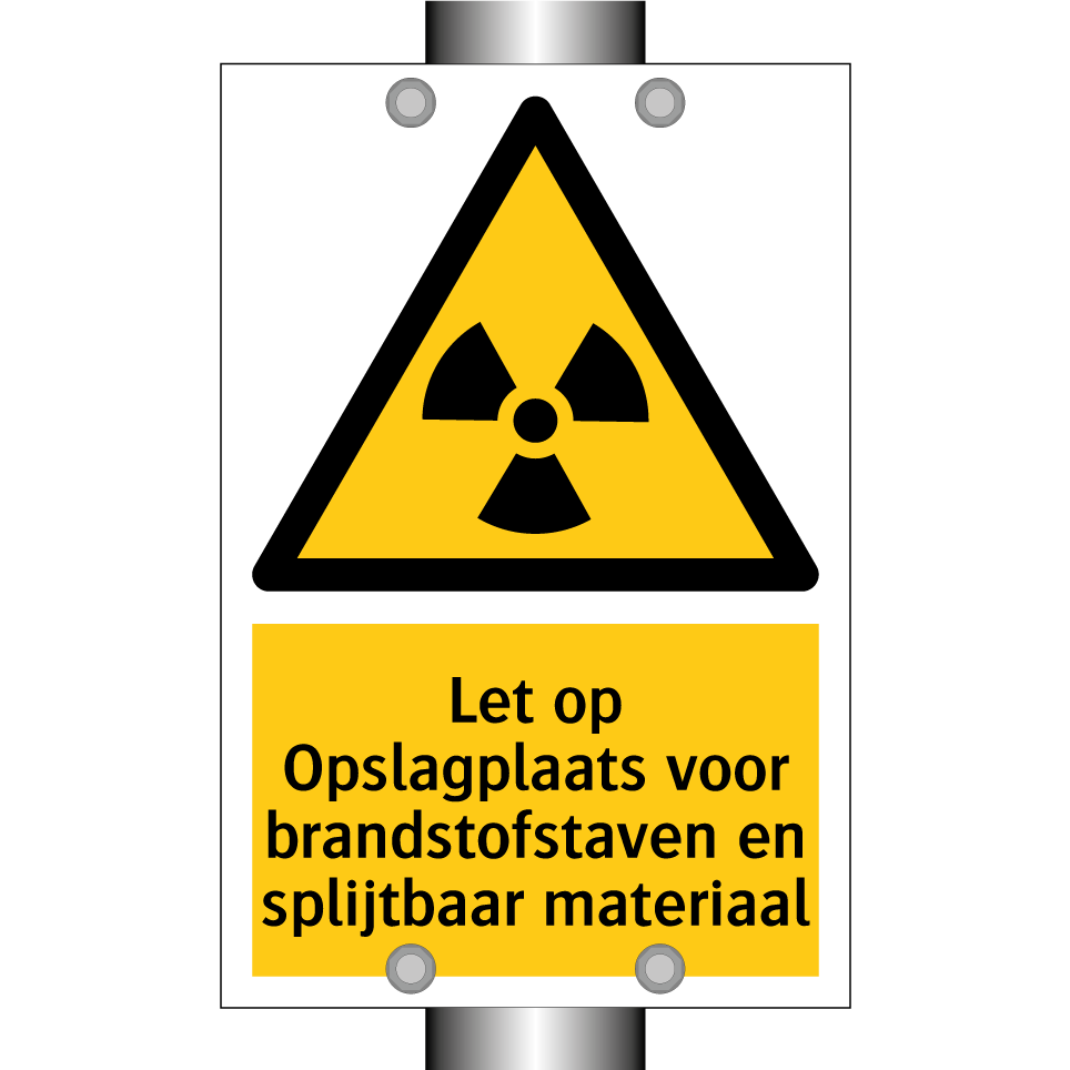 Waarschuwingsbord met de tekst Let op Opslagplaats voor brandstofstaven en splijtbaar materiaal