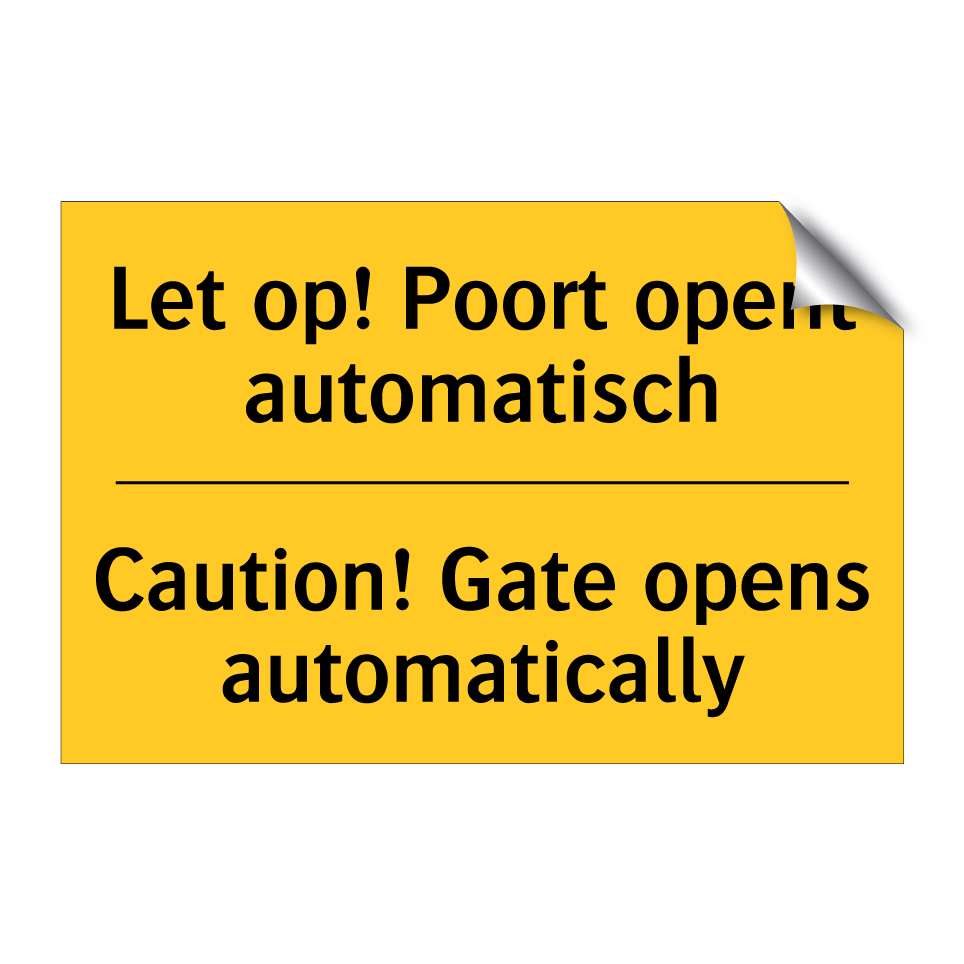 Waarschuwingsbord met de tekst Let op! Poort opent automatisch / Caution! Gate opens automatically