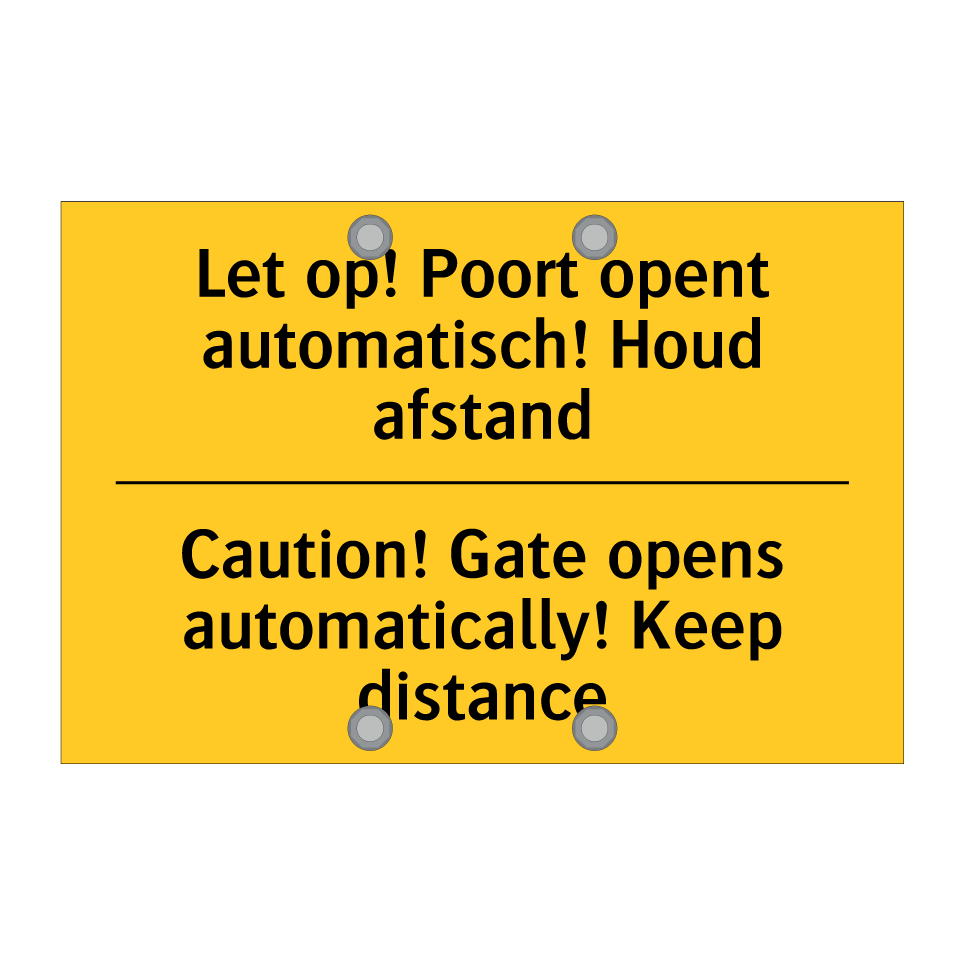 Waarschuwingsbord met de tekst Let op! Poort opent automatisch! Houd afstand / Caution! Gate opens automatically! Keep distance