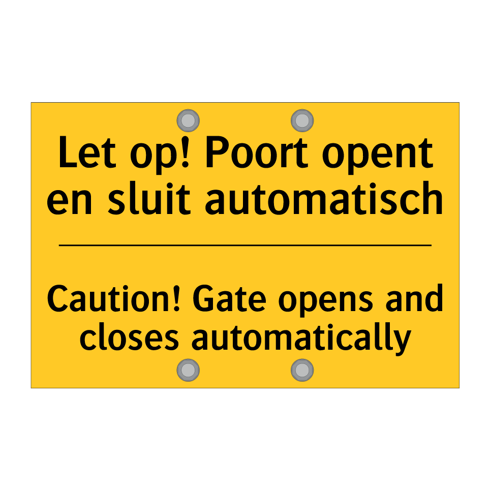 Waarschuwingsbord met de tekst Let op! Poort opent en sluit automatisch / Caution! Gate opens and closes automatically