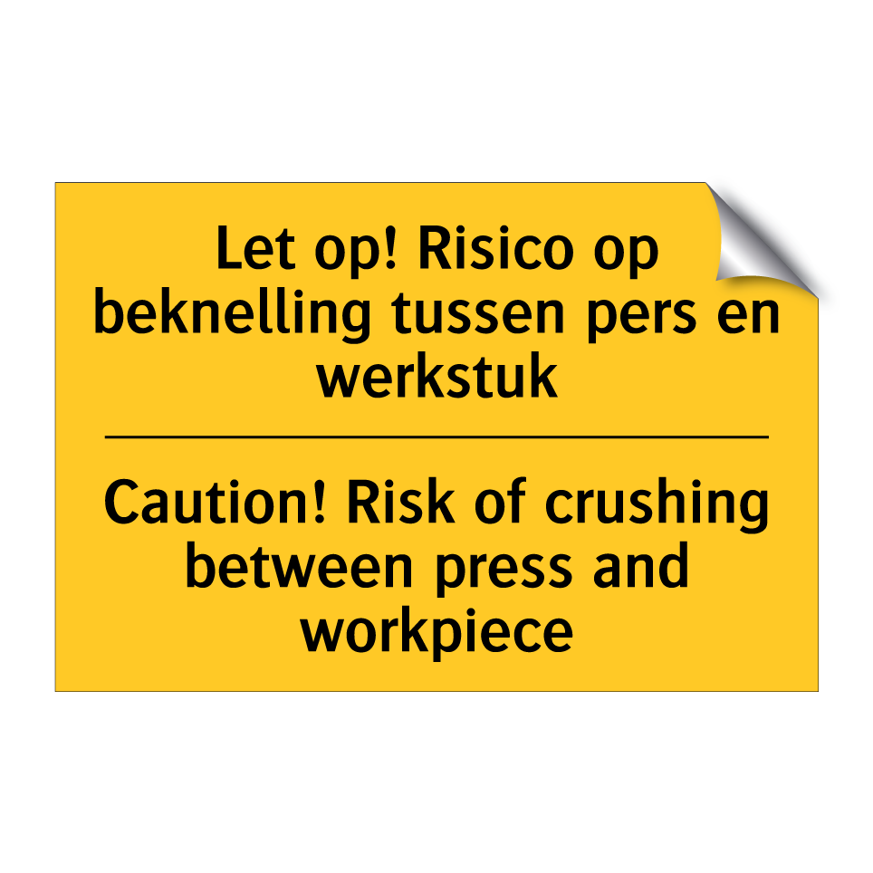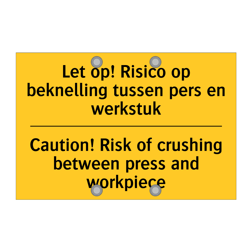 Waarschuwingsbord met de tekst Let op! Risico op beknelling tussen pers en werkstuk / Caution! Risk of crushing between press and workpiece