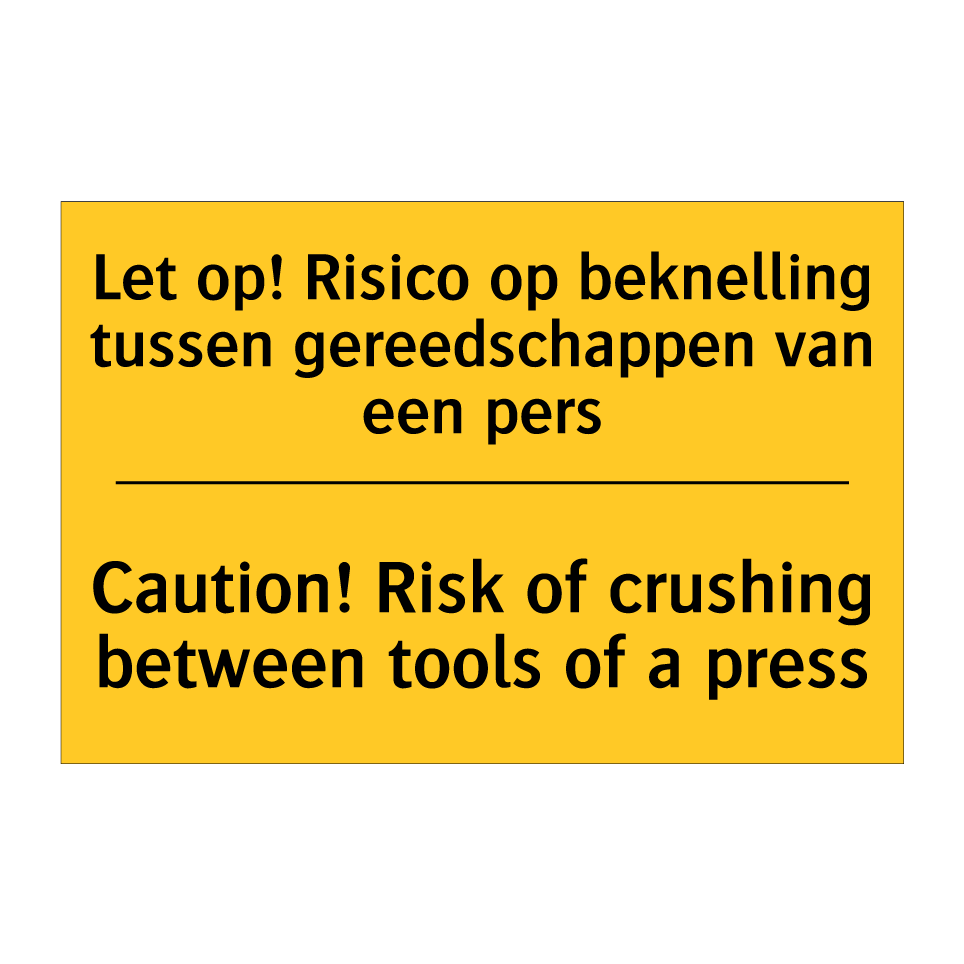 Waarschuwingsbord met de tekst Let op! Risico op beknelling tussen gereedschappen van een pers / Caution! Risk of crushing between tools of a press