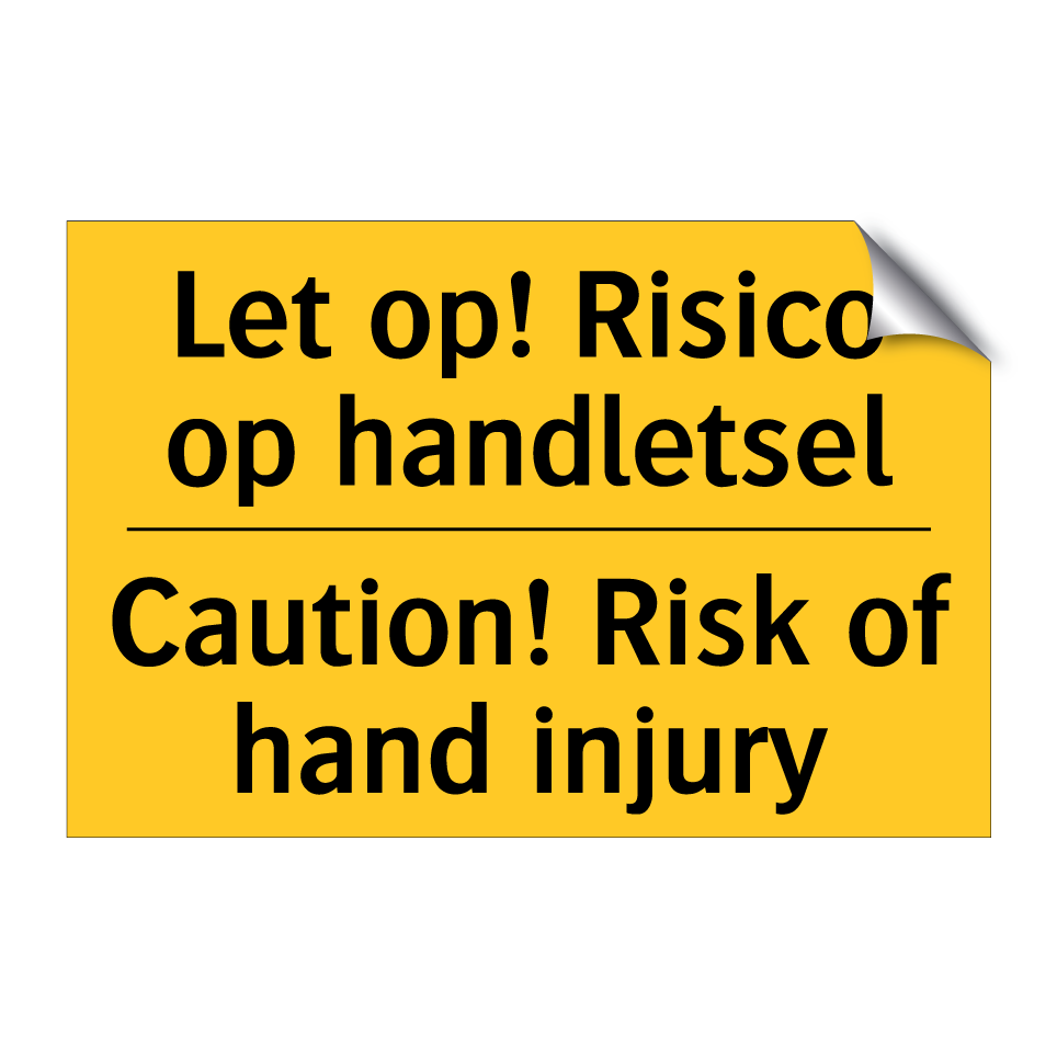 Waarschuwingsbord met de tekst Let op! Risico op handletsel / Caution! Risk of hand injury