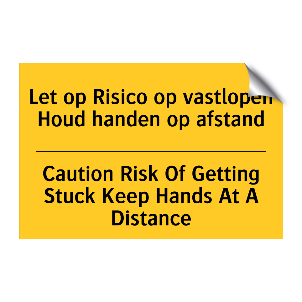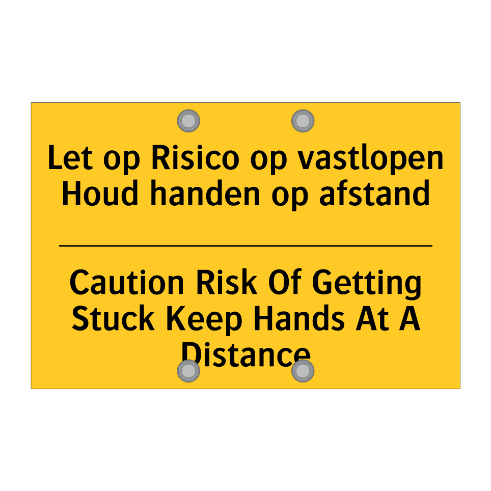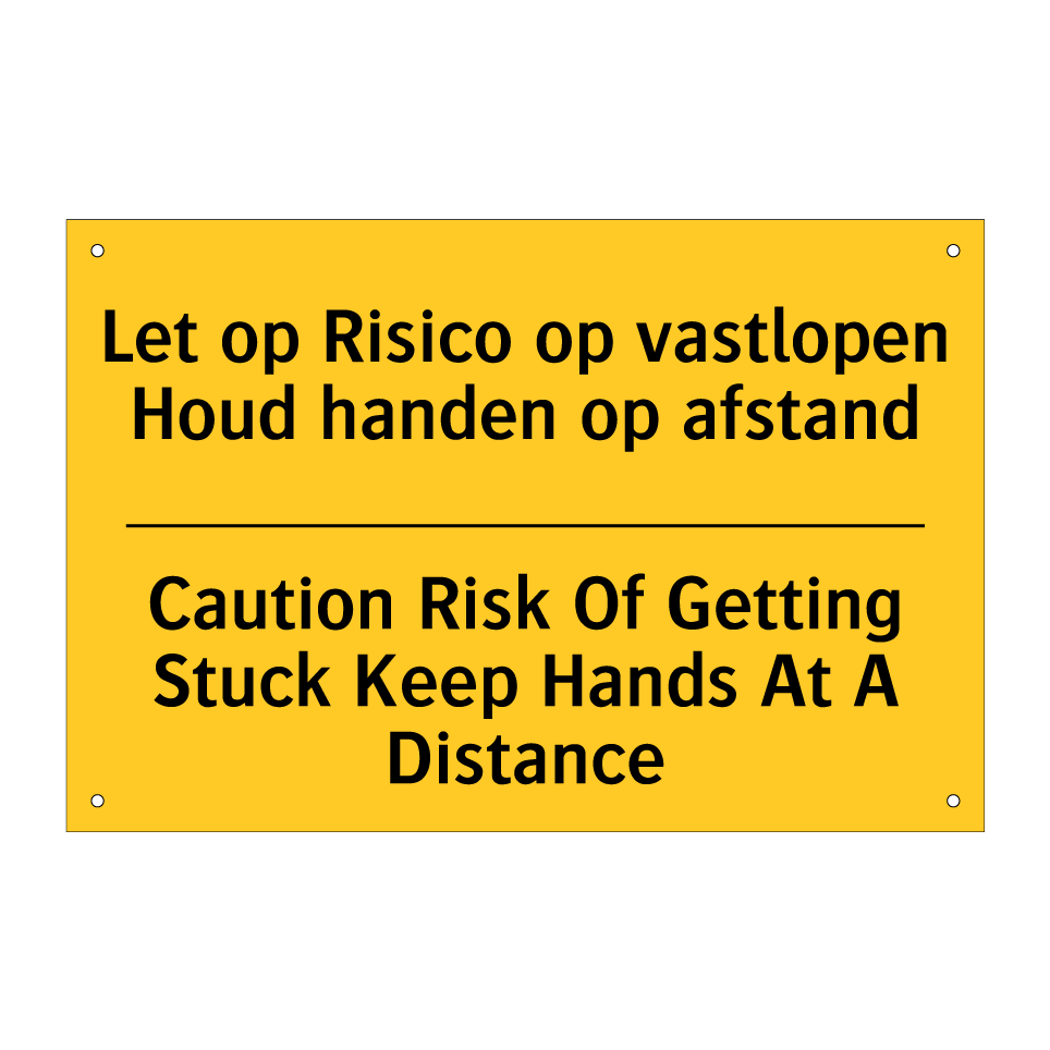 Waarschuwingsbord met de tekst Let op Risico op vastlopen Houd handen op afstand / Caution Risk Of Getting Stuck Keep Hands At A Distance
