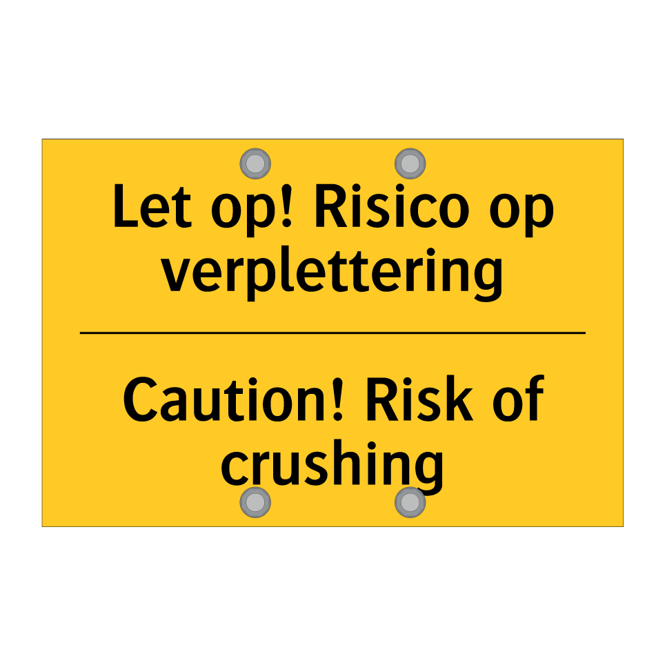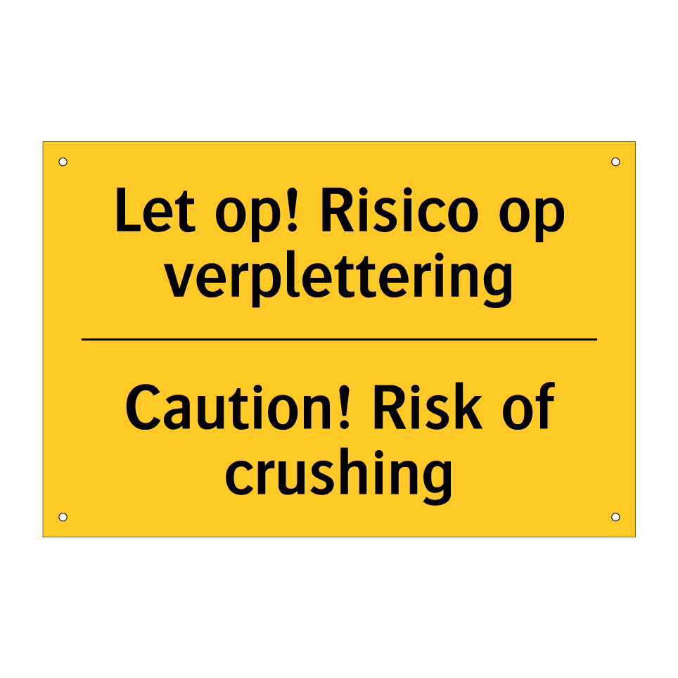 Waarschuwingsbord met de tekst Let op! Risico op verplettering / Caution! Risk of crushing