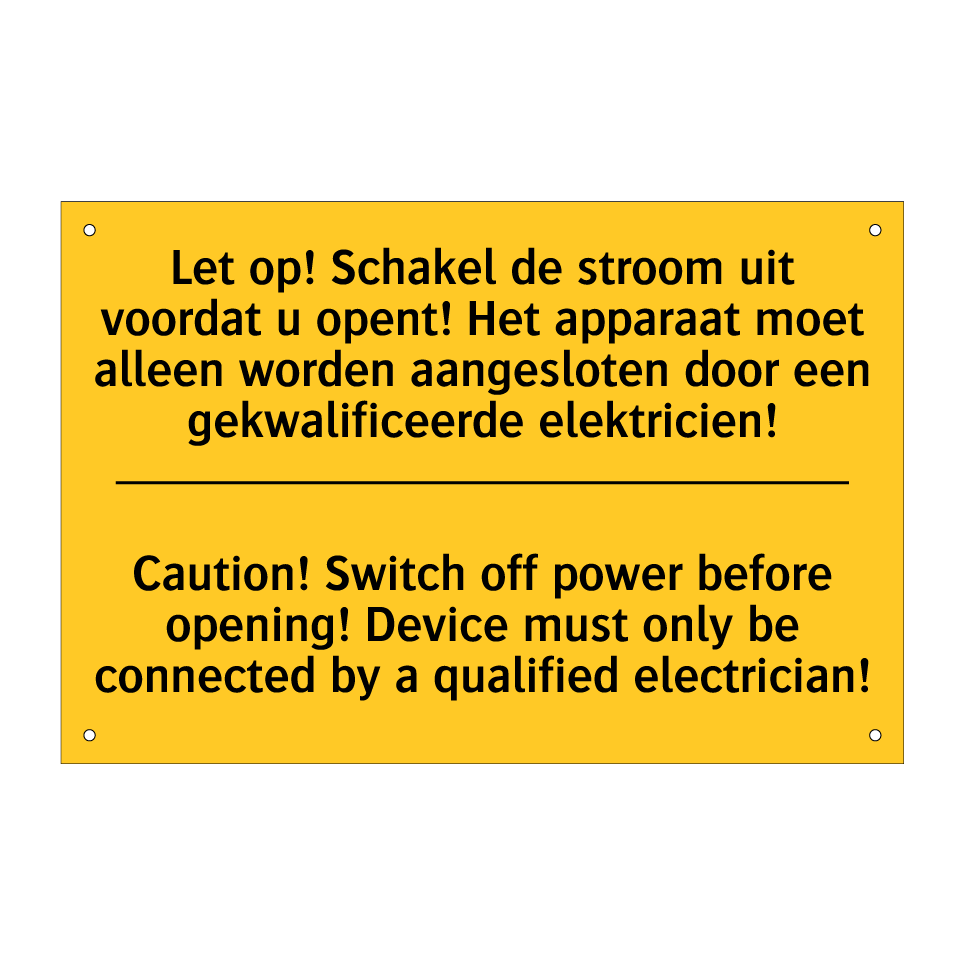 Waarschuwingsbord met de tekst Let op! Schakel de stroom uit voordat u opent! Het apparaat moet alleen worden aangesloten door een gekwalificeerde elektricien! / Caution! Switch off power before opening! Device must only be connected by a qualified electrician!