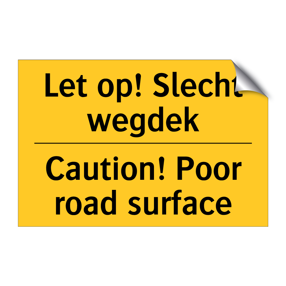 Waarschuwingsbord met de tekst Let op! Slecht wegdek / Caution! Poor road surface