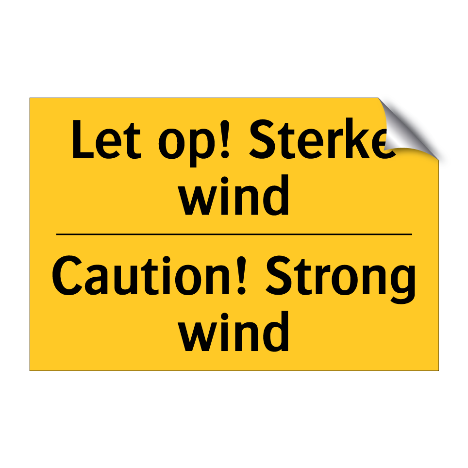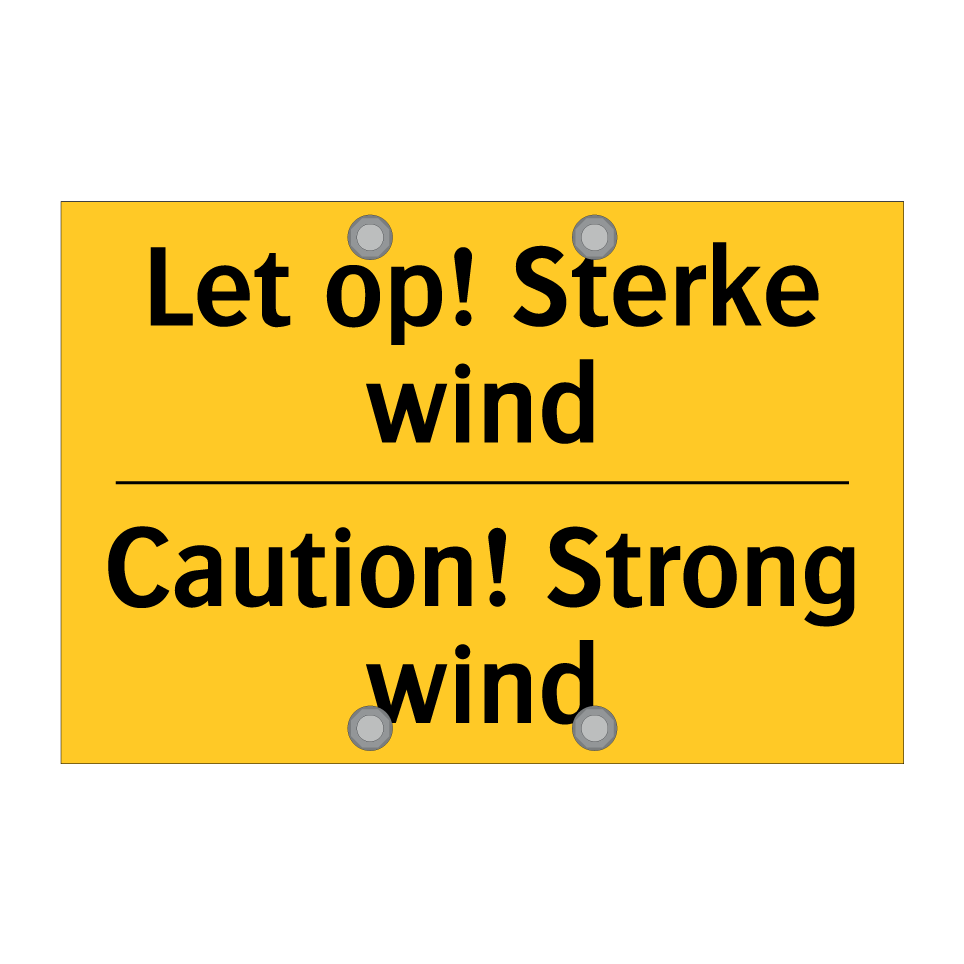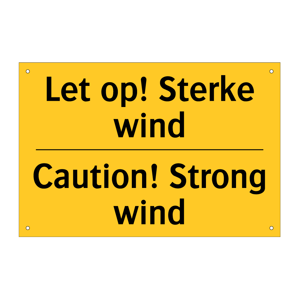 Waarschuwingsbord met de tekst Let op! Sterke wind / Caution! Strong wind