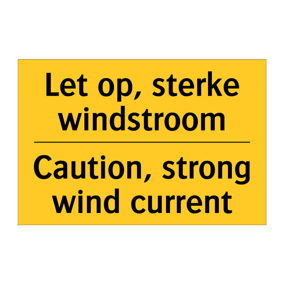 Waarschuwingsbord met de tekst Let op, sterke windstroom / Caution, strong wind current