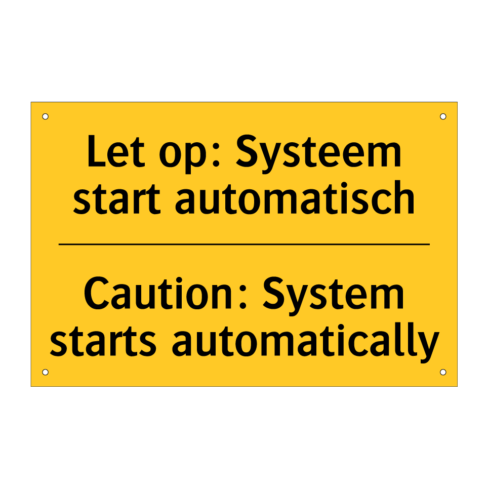 Waarschuwingsbord met de tekst Let op: Systeem start automatisch / Caution: System starts automatically