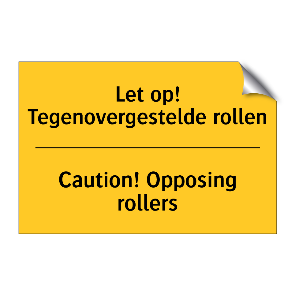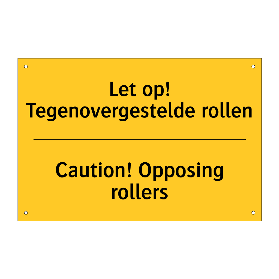 Waarschuwingsbord met de tekst Let op! Tegenovergestelde rollen / Caution! Opposing rollers