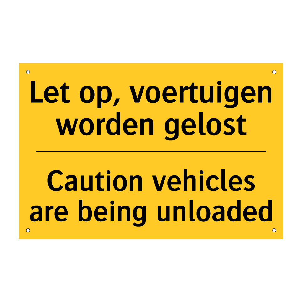 Waarschuwingsbord met de tekst Let op, voertuigen worden gelost / Caution vehicles are being unloaded