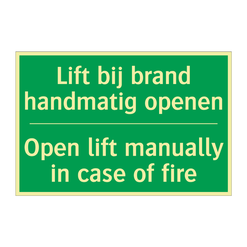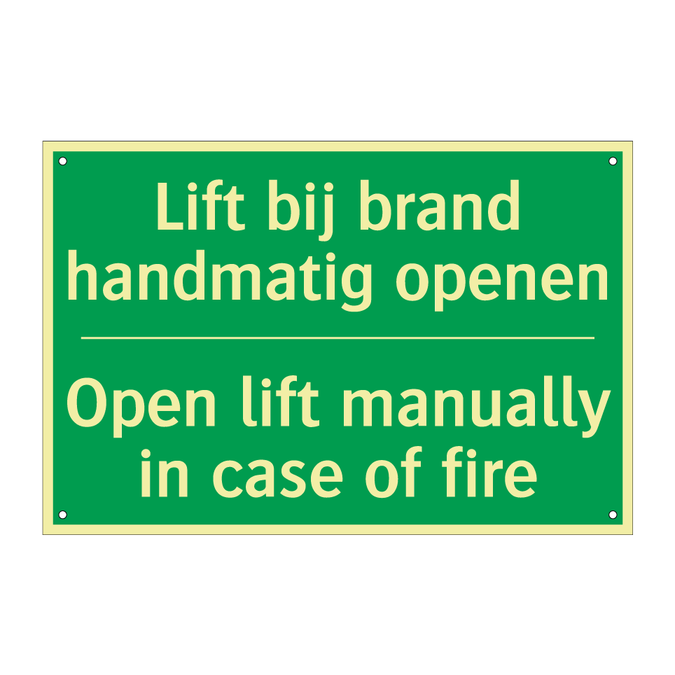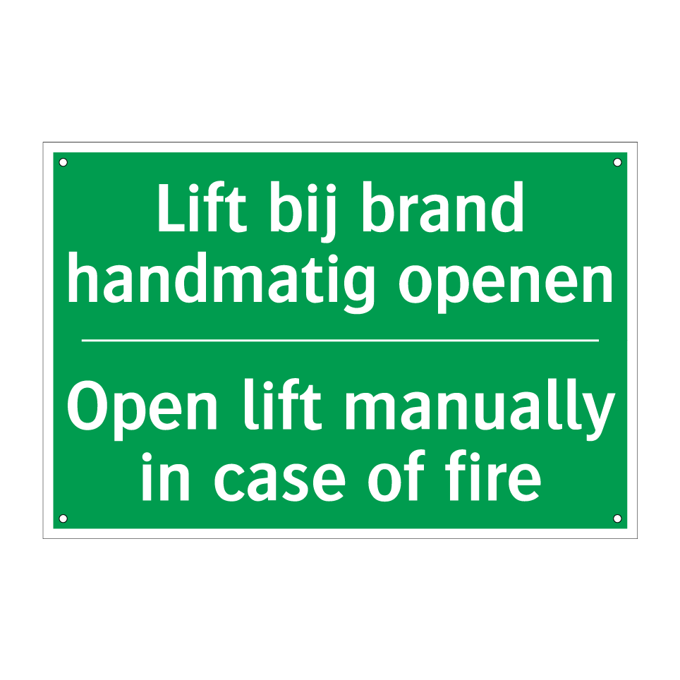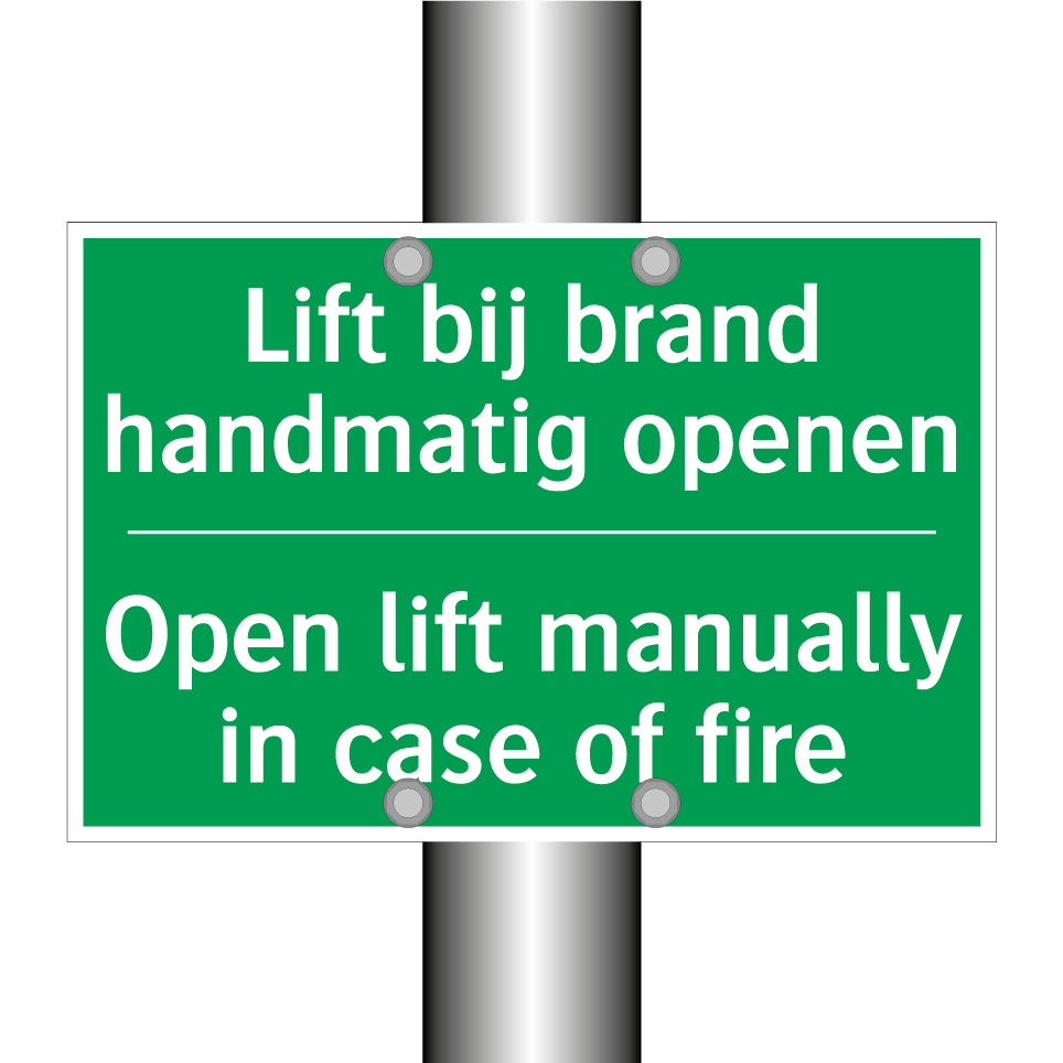 Noodbord met tekst Lift bij brand handmatig openen / Open lift manually in case of fire