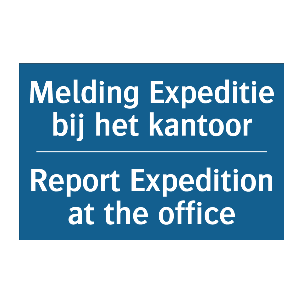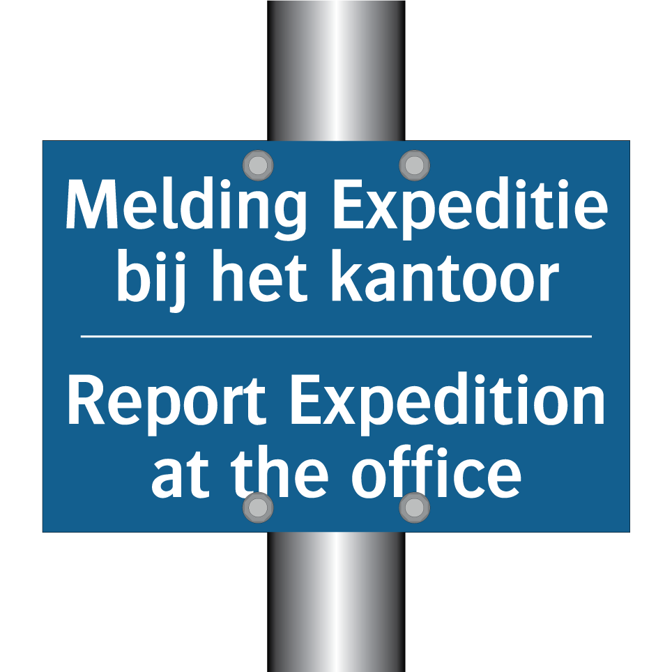 Verplichte bord met de tekst Melding Expeditie bij het kantoor - Report Expedition at the office