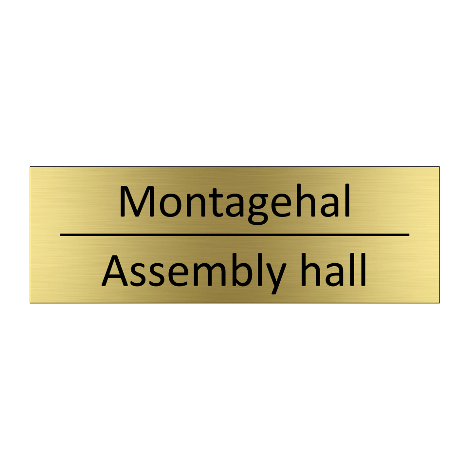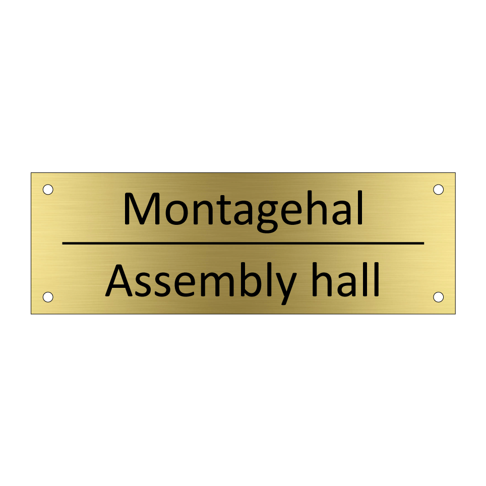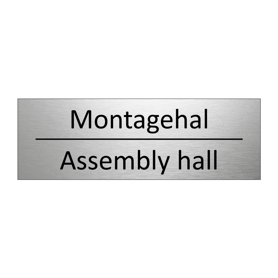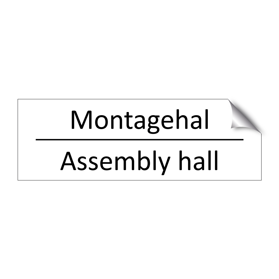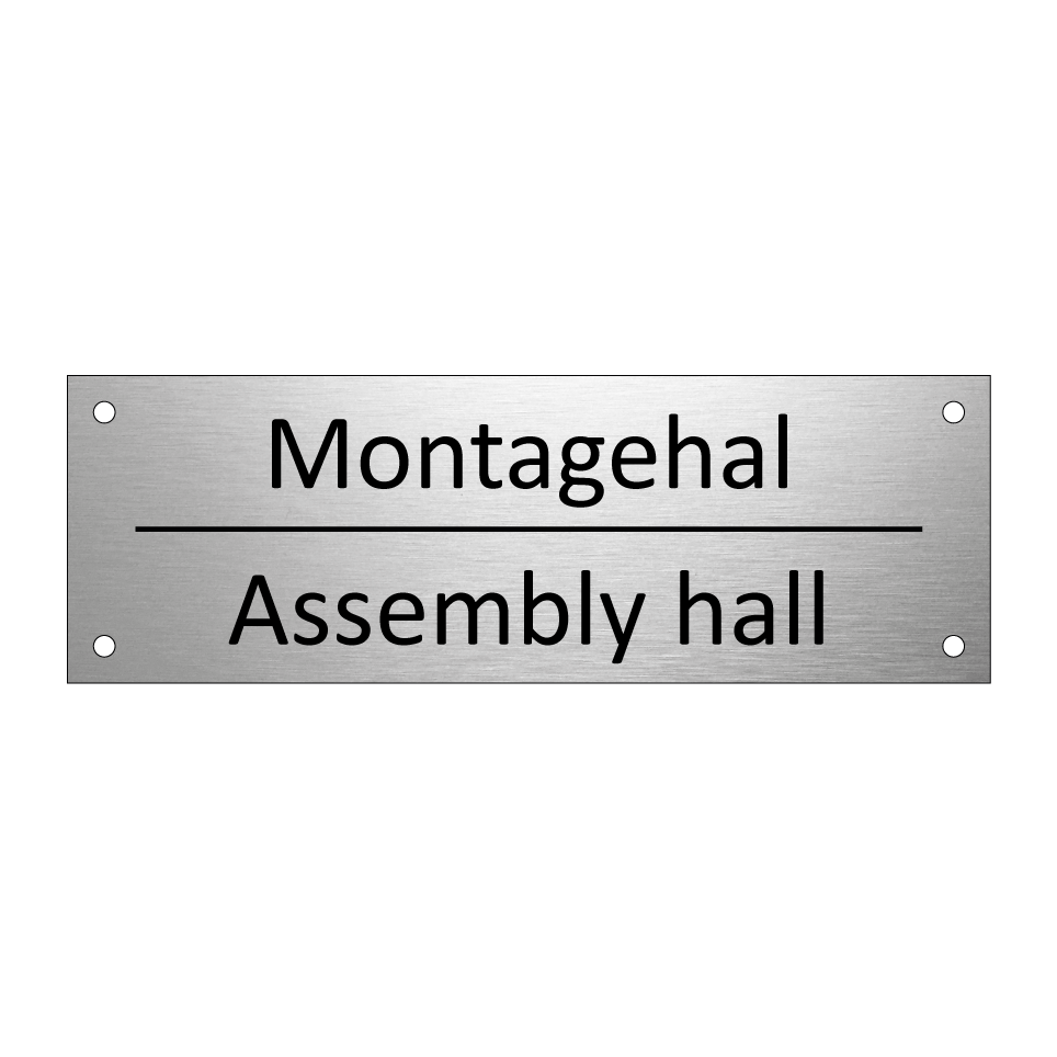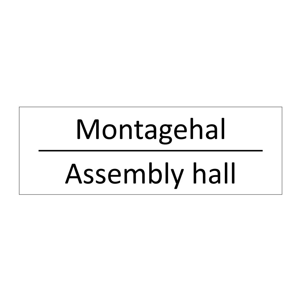 Informatiebord met tekst in het nederlands en engels. Dit bord luidt: Montagehal evenals met de engelse vertaling Assembly hall.