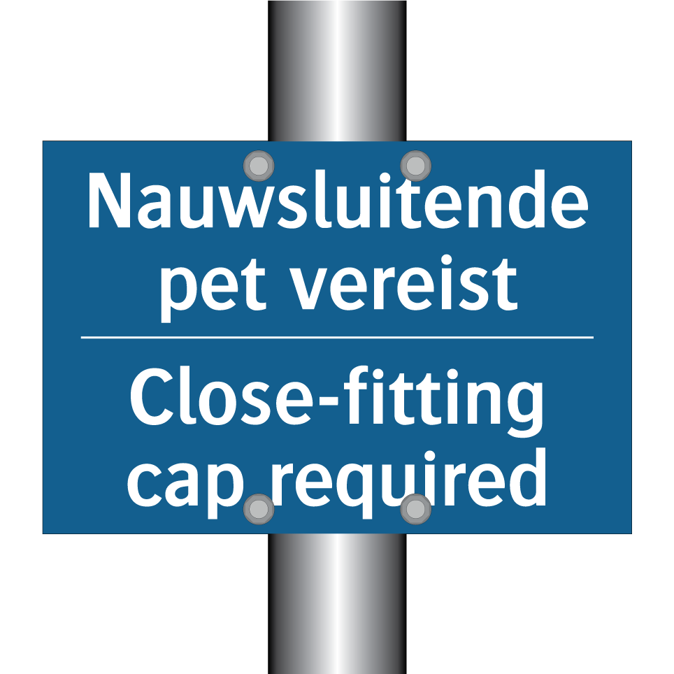 Verplichte bord met de tekst Nauwsluitende pet vereist - Close-fitting cap required