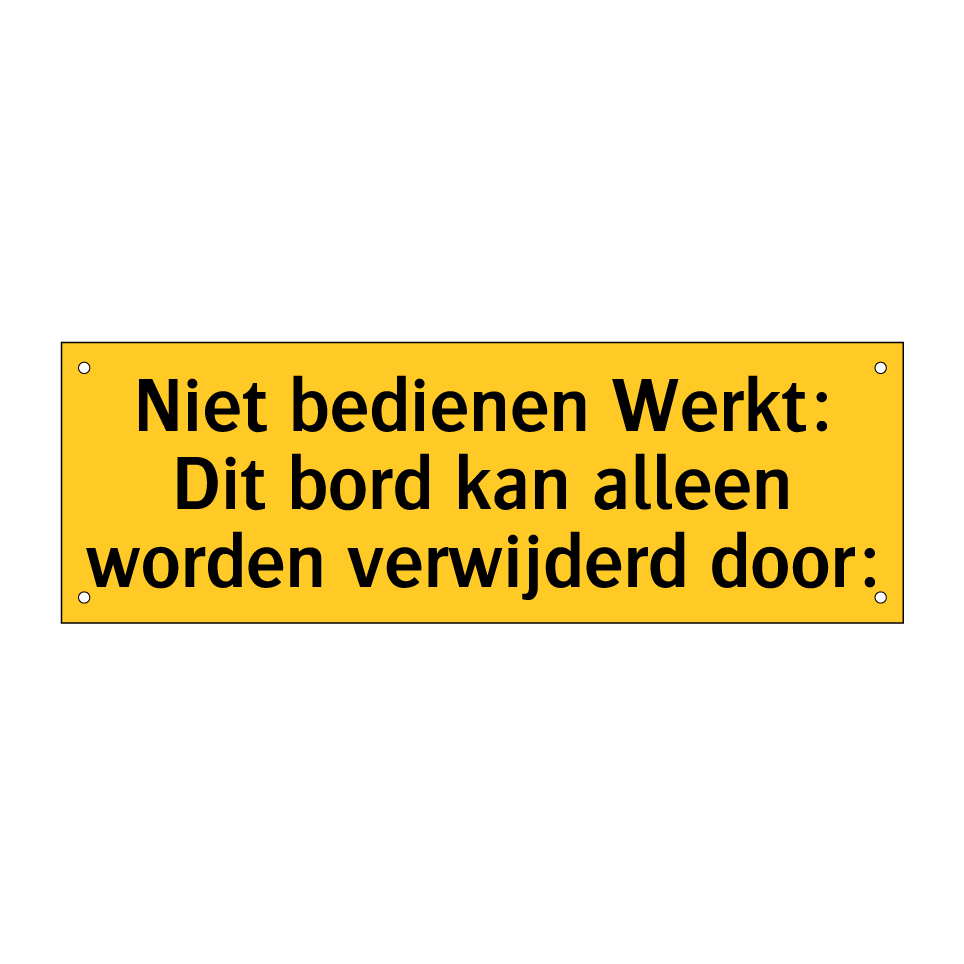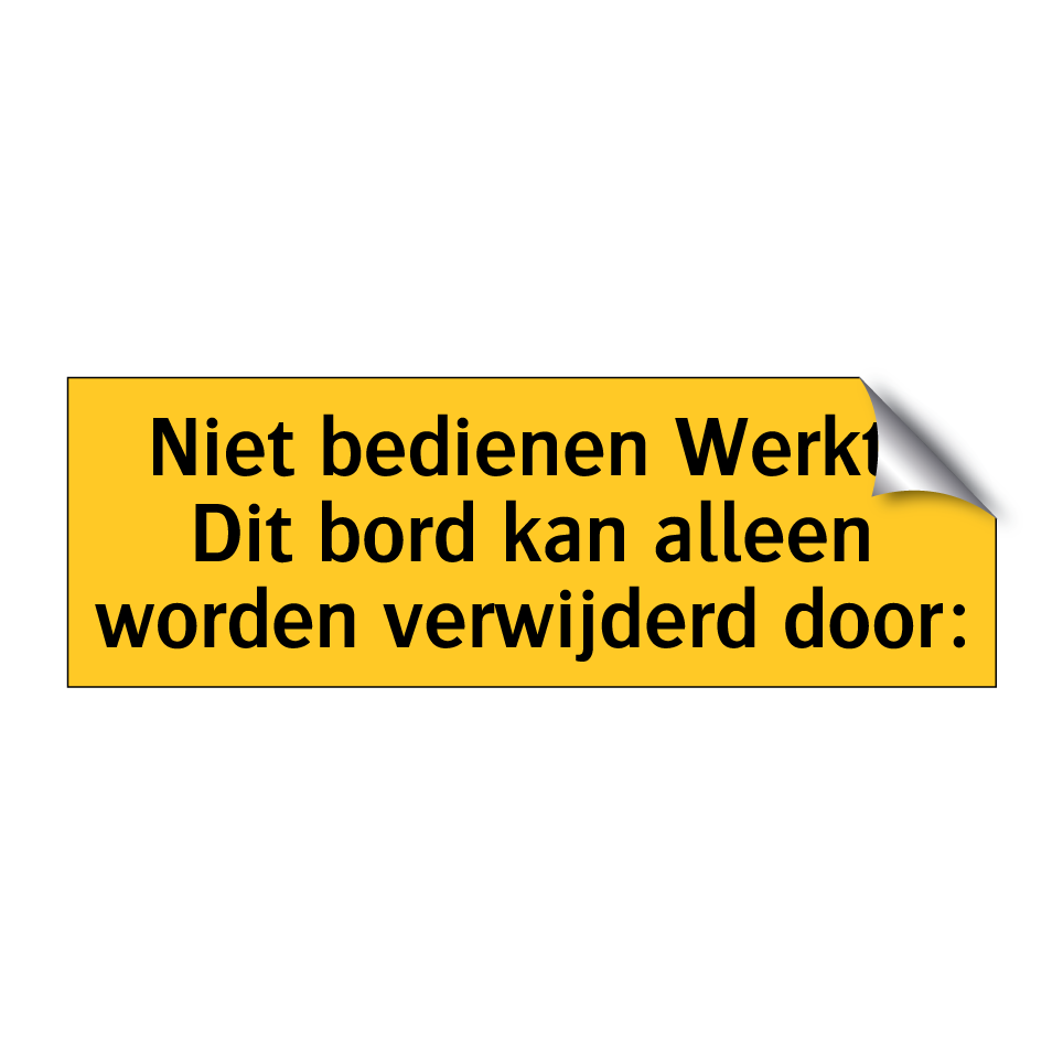 Waarschuwingsbord met de tekst Niet bedienen Werkt: Dit bordje kan alleen worden verwijderd door: