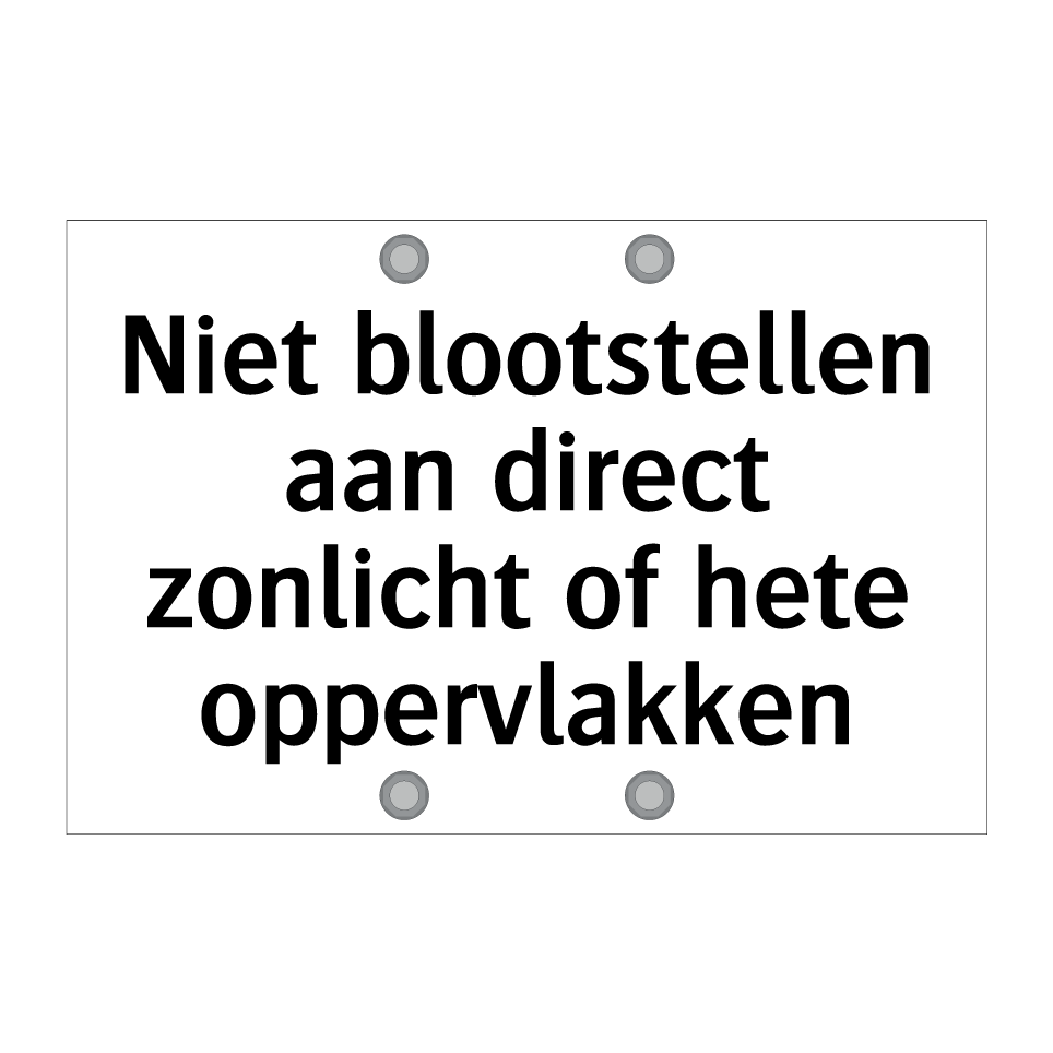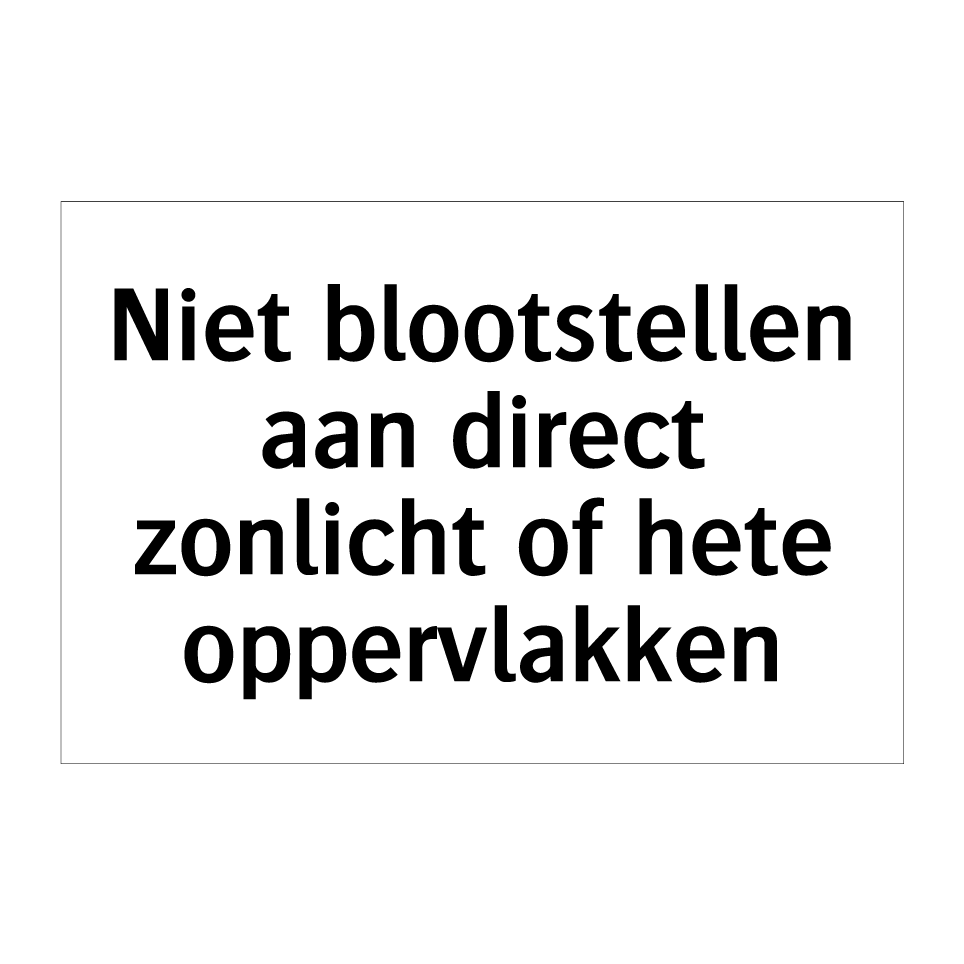 Verbodsbord met de tekst Niet blootstellen aan direct zonlicht of hete oppervlakken