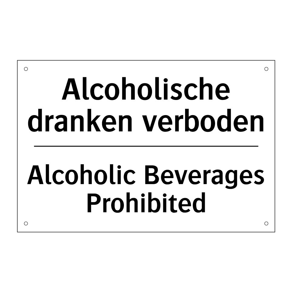 Deze verbodsbord is ideaal voor het handhaven van regels op locaties waar alcoholconsumptie niet is toegestaan. Met duidelijke, tweetalige tekst in zowel Nederlands als Engels, zorgt dit bord ervoor dat de boodschap voor een breder publiek toegankelijk is. Dit maakt het perfect voor internationale omgevingen zoals luchthavens, evenementenlocaties en openbare ruimtes. Door het strategisch te plaatsen bij ingangen, bars of andere relevante plekken, helpt het om ongewenst gedrag te voorkomen en een veilige en ordelijke omgeving te behouden. Het gebruik van zowel Nederlands als Engels vergroot de effectiviteit en zorgt voor een duidelijke communicatie naar zowel lokale als internationale bezoekers.
