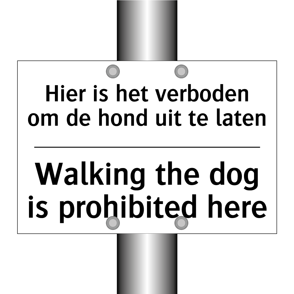 Verbodsbord met de tekst Hier is het verboden om de hond uit te laten en in het Engels: Walking the dog is prohibited here
