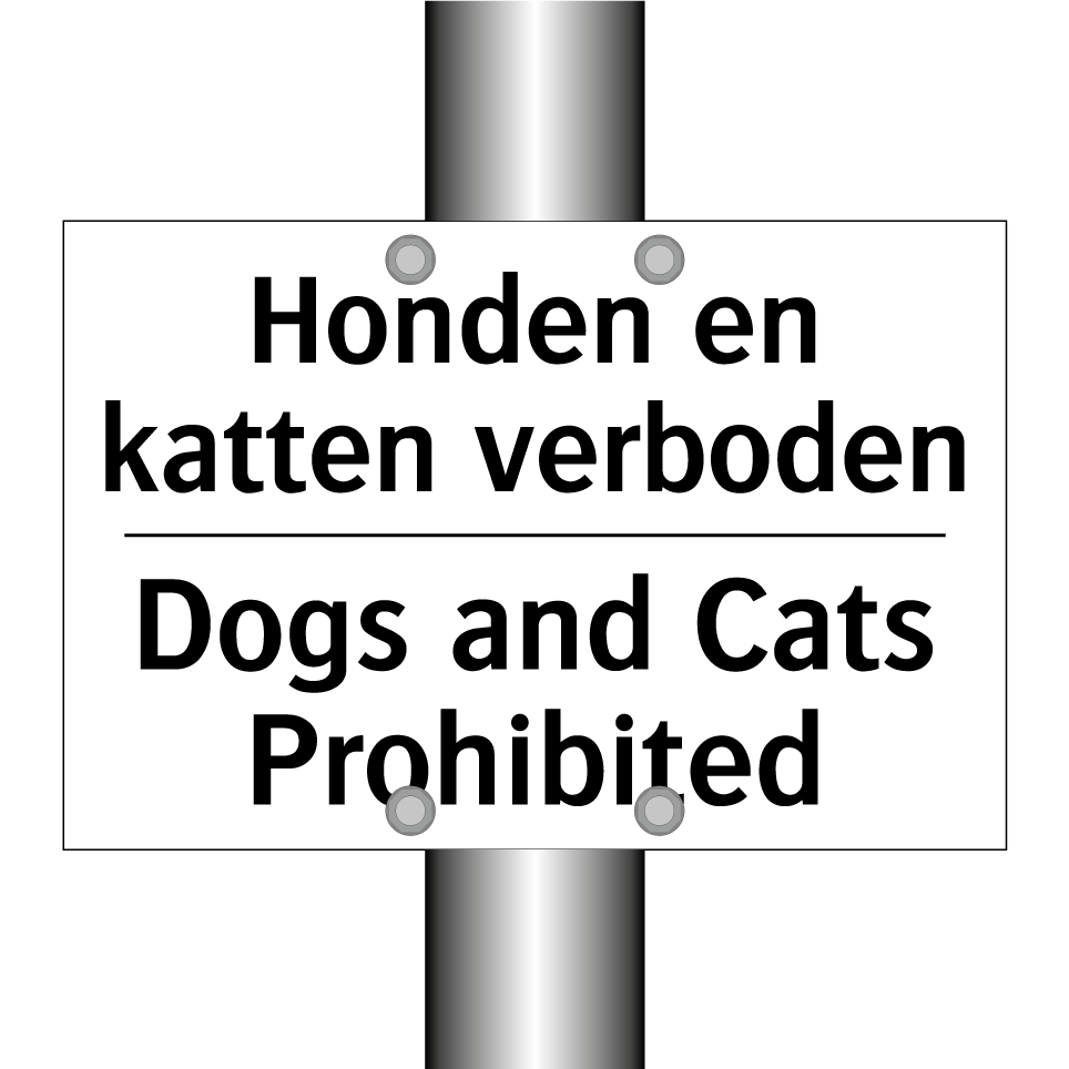 Verbodsbord met de tekst Honden en katten verboden en in het Engels: Dogs and Cats Prohibited