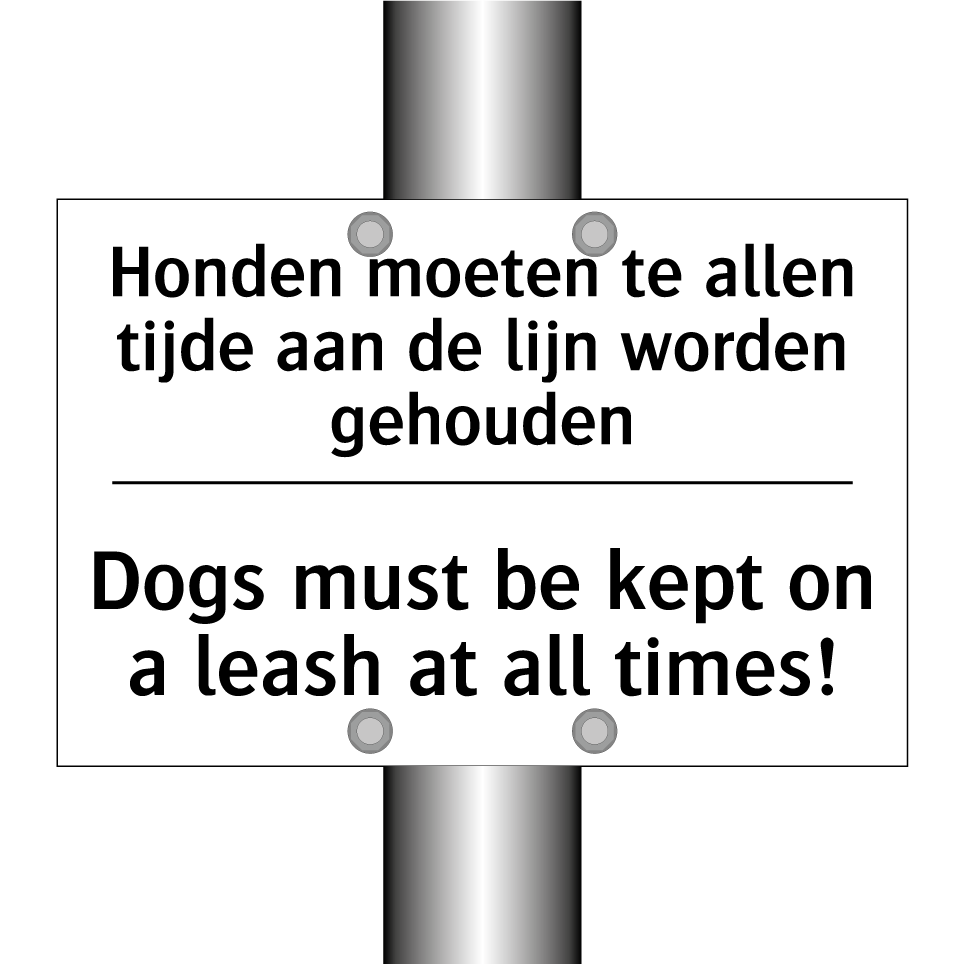 Verbodsbord met de tekst Honden moeten te allen tijde aan de lijn worden gehouden en in het Engels: Dogs must be kept on a leash at all times!