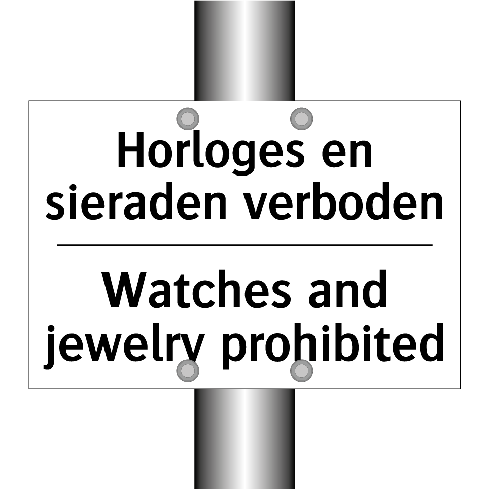 Verbodsbord met de tekst Horloges en sieraden verboden en in het Engels: Watches and jewelry prohibited