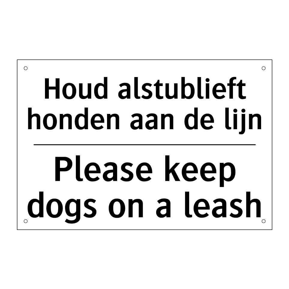 Deze verbodsbord is ideaal voor het handhaven van regels in openbare ruimtes en privéterreinen. Met een duidelijke boodschap in zowel het Nederlands als het Engels, zorgt deze bord ervoor dat bezoekers van verschillende nationaliteiten de instructies begrijpen. Dit is vooral nuttig in toeristische gebieden, parken, en recreatiegebieden waar internationale bezoekers vaak komen. Door honden aan de lijn te houden, draagt deze bord bij aan de veiligheid en het comfort van alle bezoekers. Plaats deze bord bij ingangen, langs wandelpaden of in de buurt van speelplaatsen om ervoor te zorgen dat de regels duidelijk en zichtbaar zijn voor iedereen.