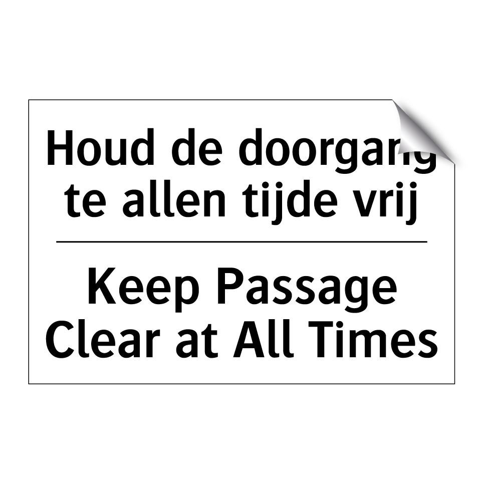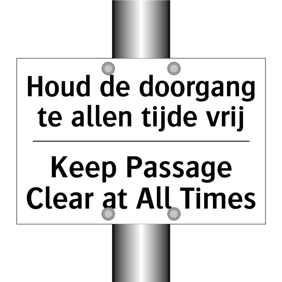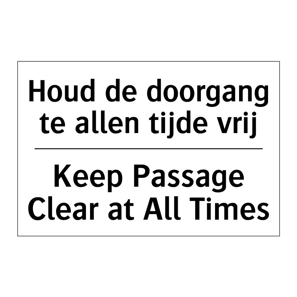 Verbodsbord met de tekst Houd de doorgang te allen tijde vrij en in het Engels: Keep Passage Clear at All Times
