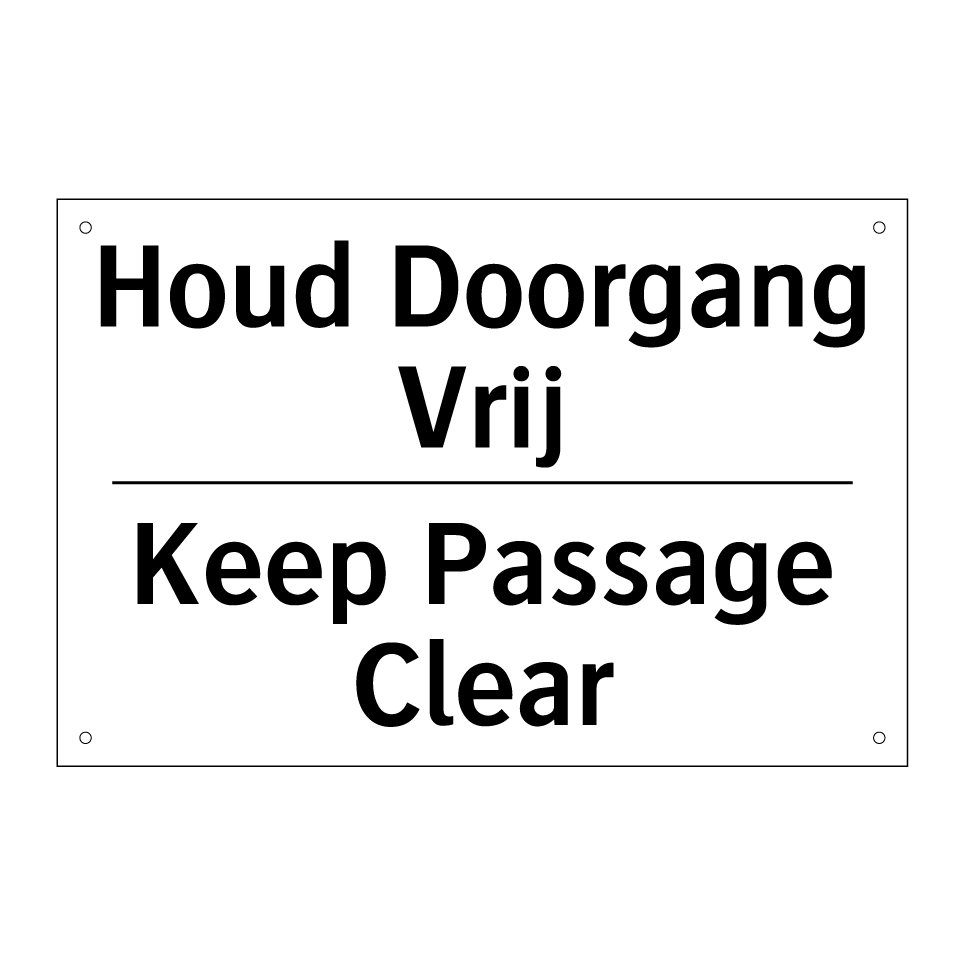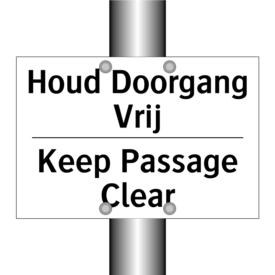 Verbodsbord met de tekst Houd Doorgang Vrij en in het Engels: Keep Passage Clear