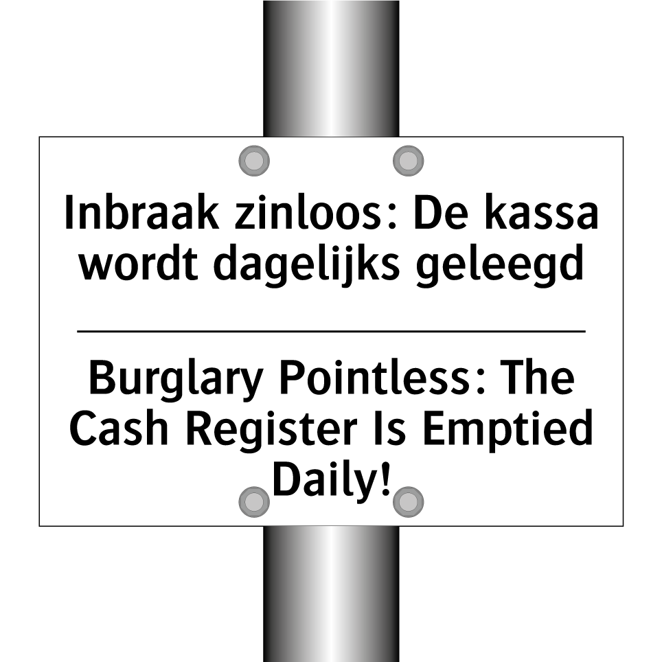 Verbodsbord met de tekst Inbraak zinloos: De kassa wordt dagelijks geleegd en in het Engels: Burglary Pointless: The Cash Register Is Emptied Daily!