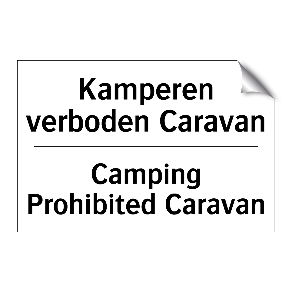 Verbodsbord met de tekst Kamperen verboden Caravan en in het Engels: Camping Prohibited Caravan