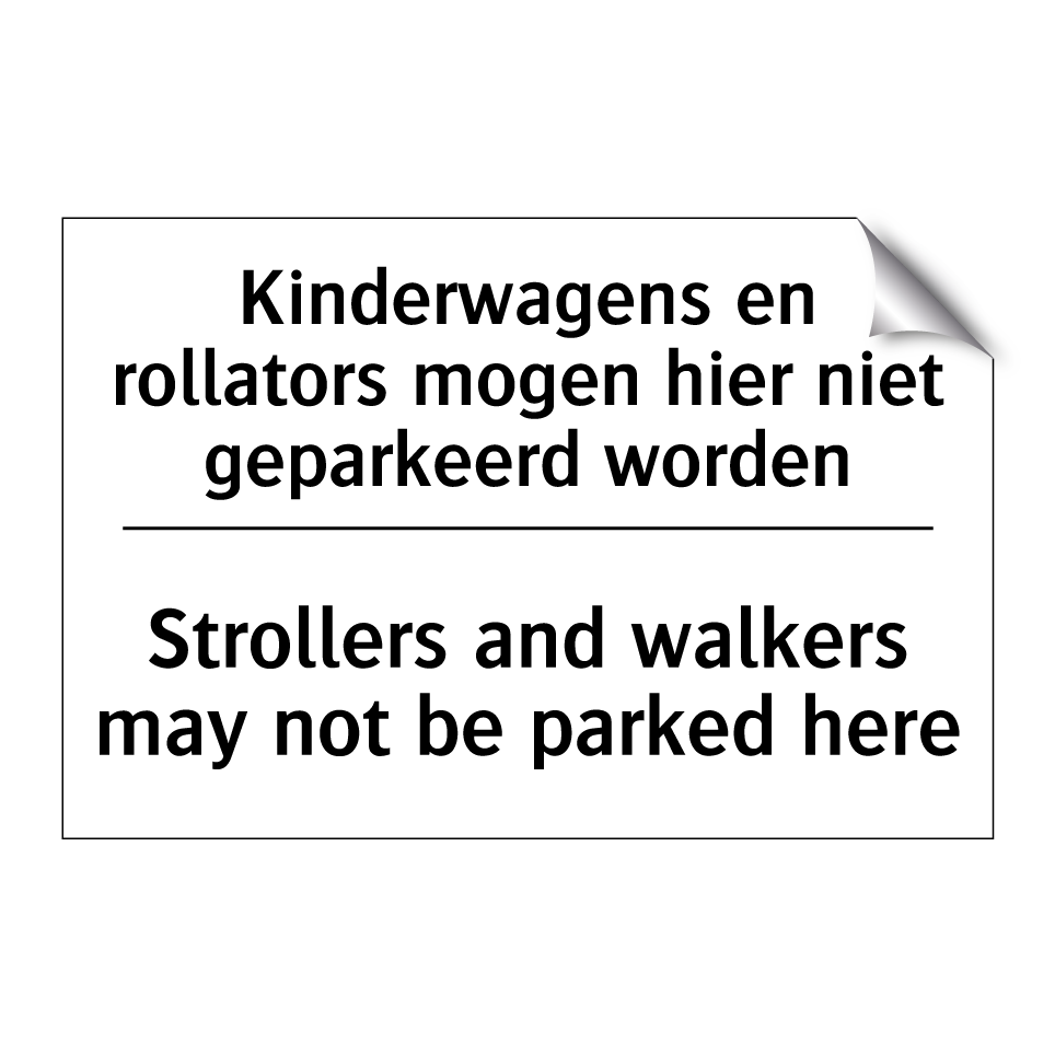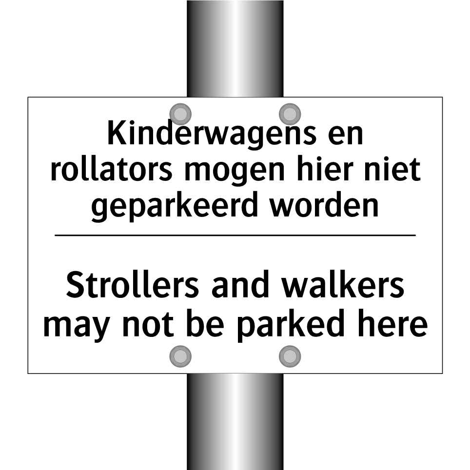 Verbodsbord met de tekst Kinderwagens en rollators mogen hier niet geparkeerd worden en in het Engels: Strollers and walkers may not be parked here
