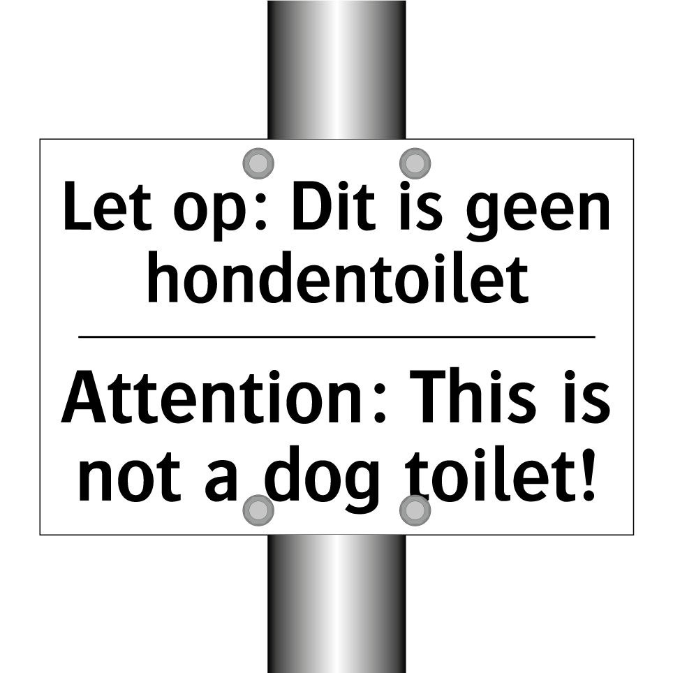 Verbodsbord met de tekst Let op: Dit is geen hondentoilet en in het Engels: Attention: This is not a dog toilet!