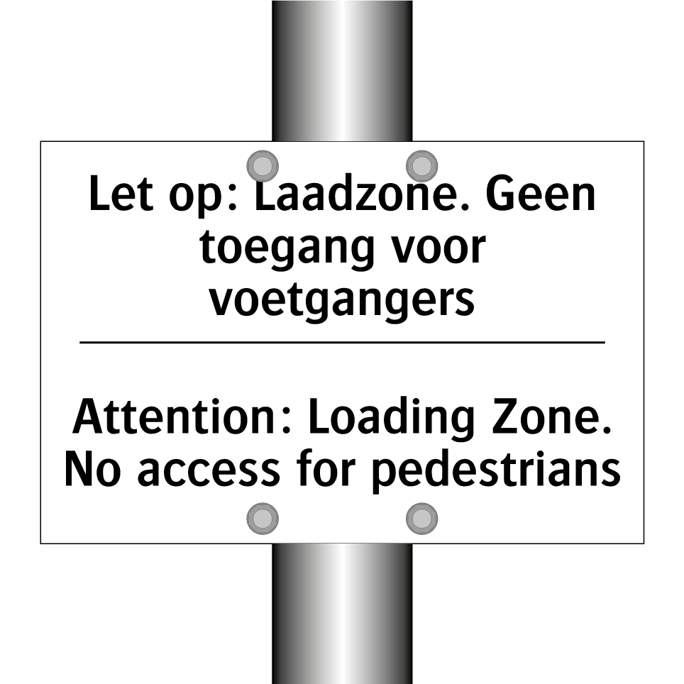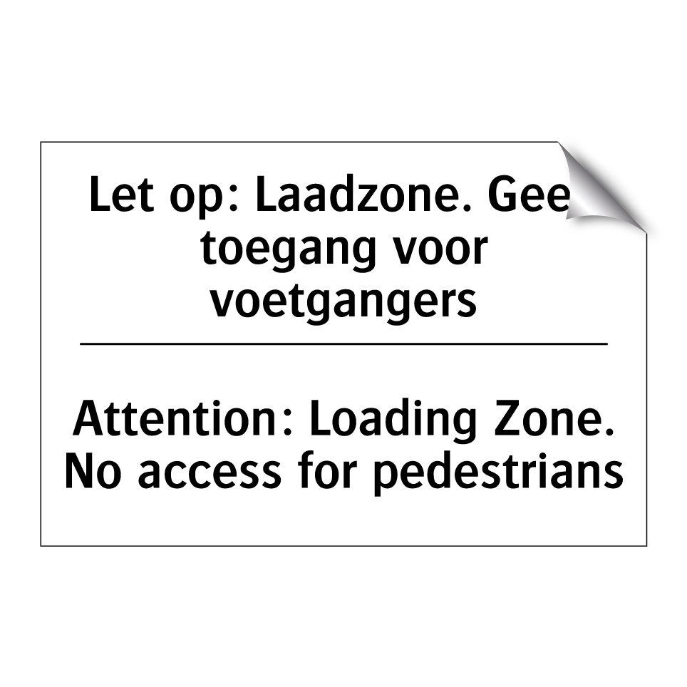 Verbodsbord met de tekst Let op: Laadzone. Geen toegang voor voetgangers en in het Engels: Attention: Loading Zone. No access for pedestrians