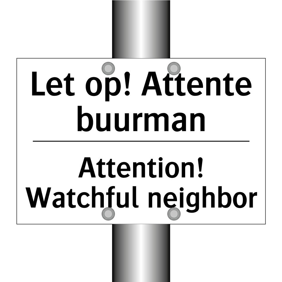 Verbodsbord met de tekst Let op! Attente buurman en in het Engels: Attention! Watchful neighbor