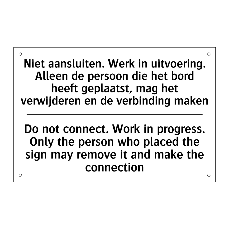 Verbodsbord met de tekst Niet aansluiten. Werk in uitvoering. Alleen de persoon die het bord heeft geplaatst, mag het verwijderen en de verbinding maken en in het Engels: Do not connect. Work in progress. Only the person who placed the sign may remove it and make the connection