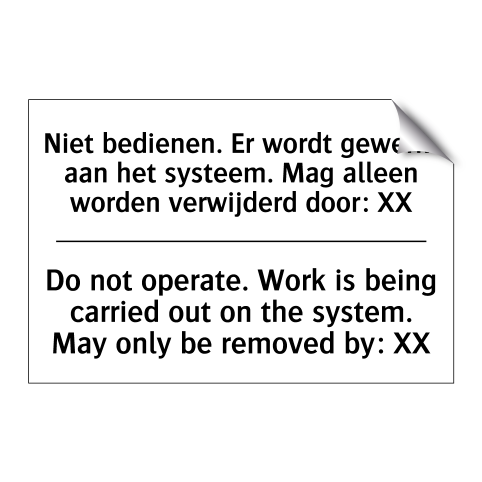 Verbodsbord met de tekst Niet bedienen. Er wordt gewerkt aan het systeem. Mag alleen worden verwijderd door: XX en in het Engels: Do not operate. Work is being carried out on the system. May only be removed by: XX
