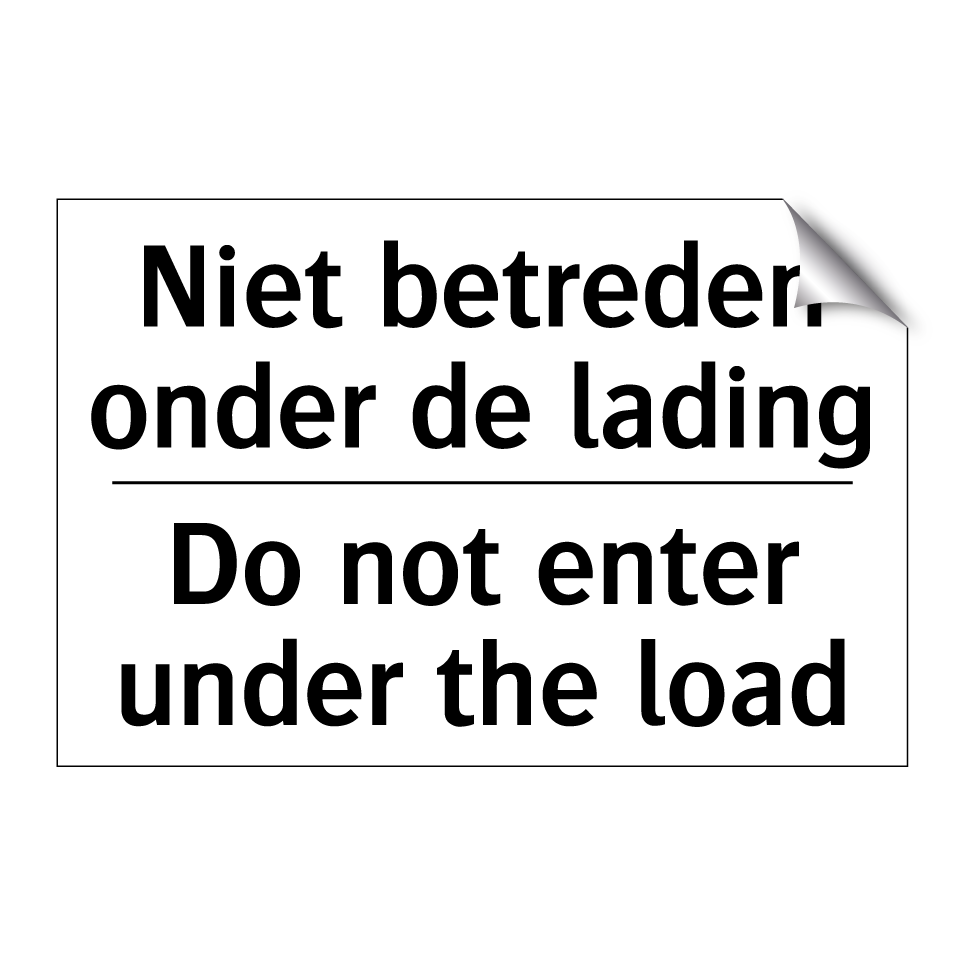 Verbodsbord met de tekst Niet betreden onder de lading en in het Engels: Do not enter under the load
