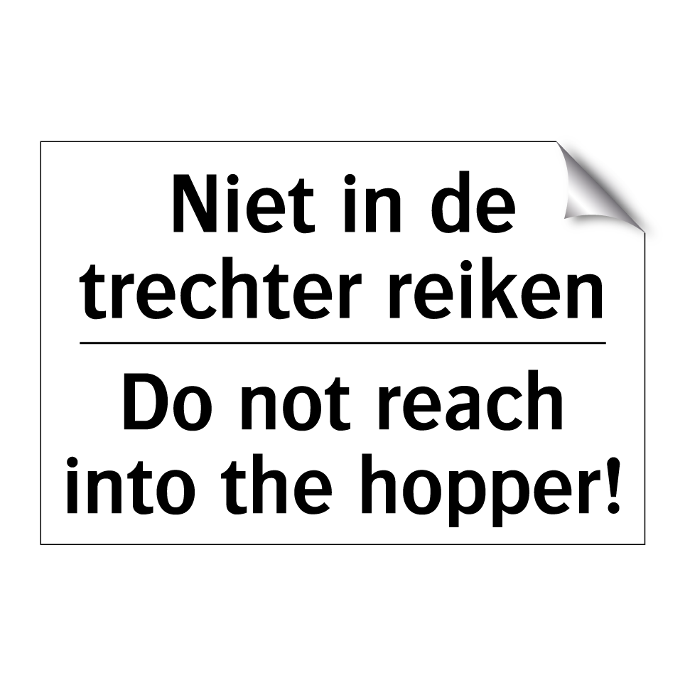 Verbodsbord met de tekst Niet in de trechter reiken en in het Engels: Do not reach into the hopper!