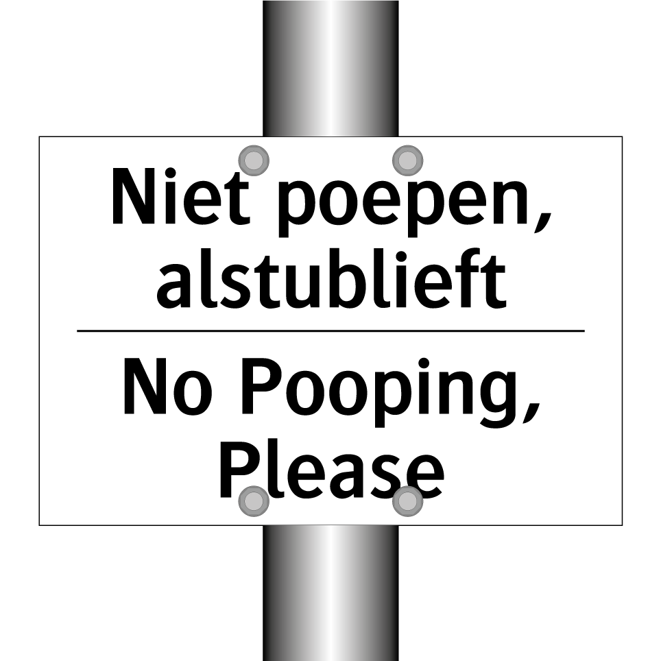 Verbodsbord met de tekst Niet poepen, alstublieft en in het Engels: No Pooping, Please