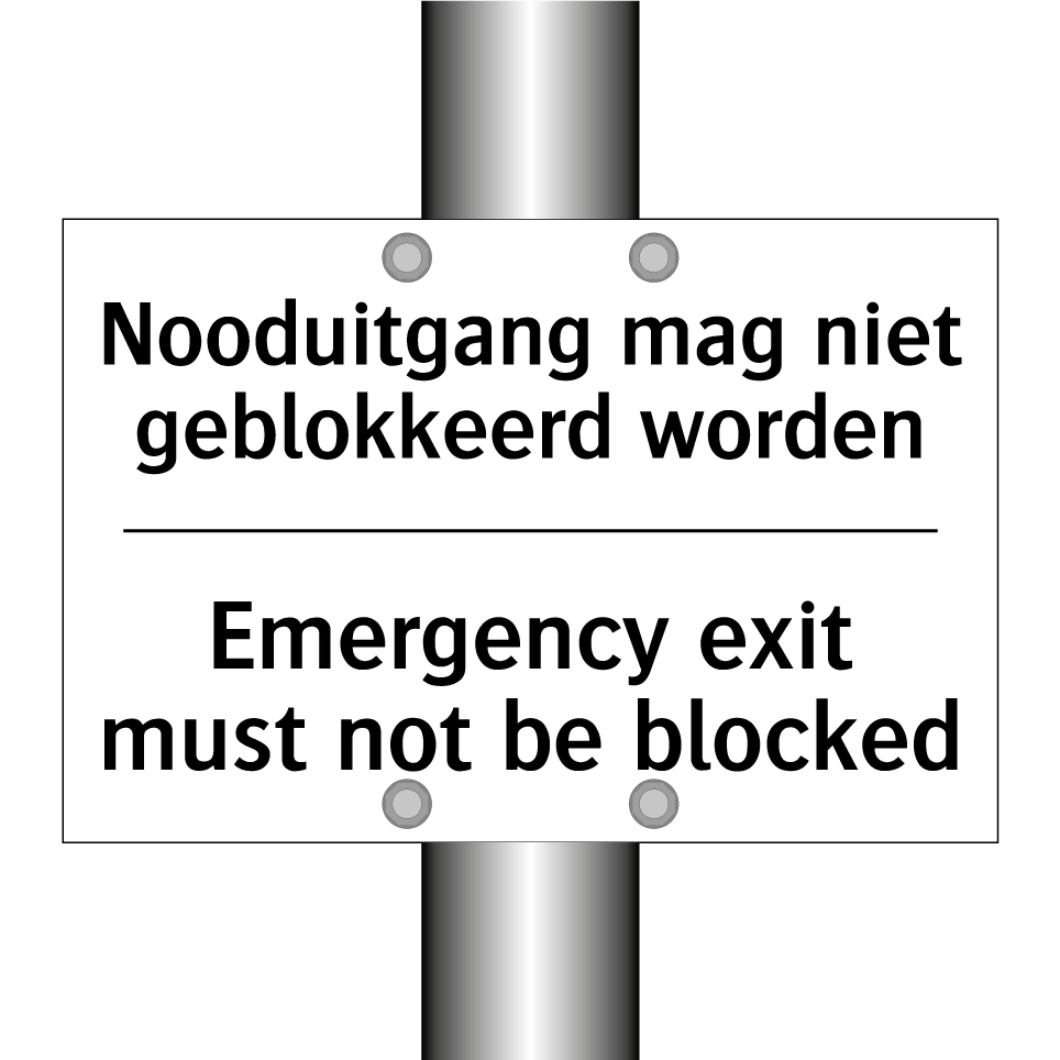 Verbodsbord met de tekst Nooduitgang mag niet geblokkeerd worden en in het Engels: Emergency exit must not be blocked