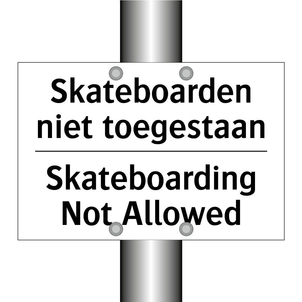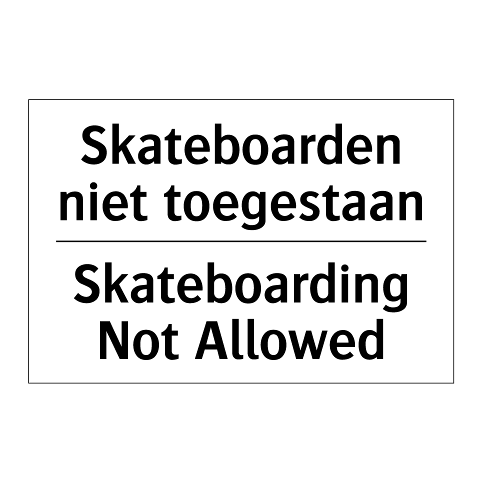 Verbodsbord met de tekst Skateboarden niet toegestaan en in het Engels: Skateboarding Not Allowed