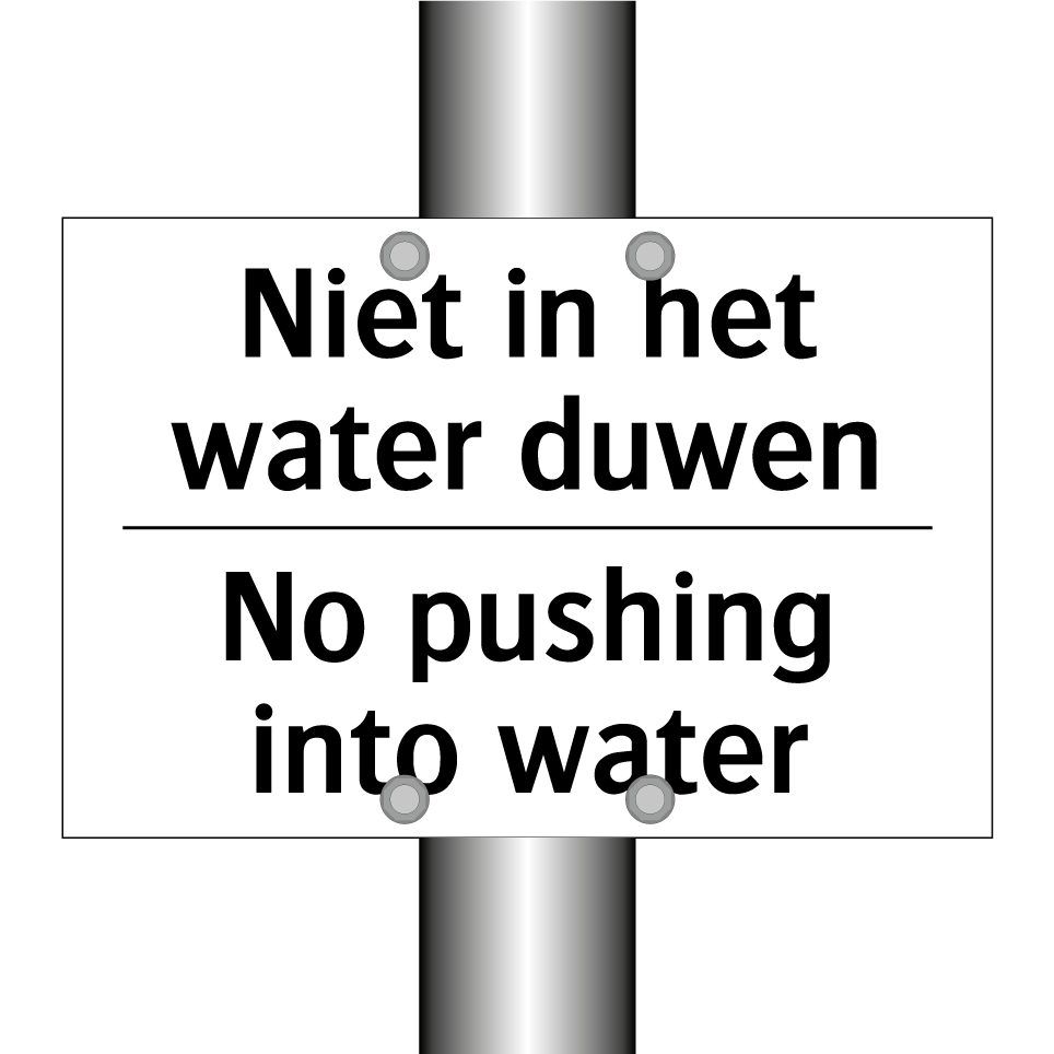 Verbodsbord met de tekst Niet in het water duwen en in het Engels: No pushing into water
