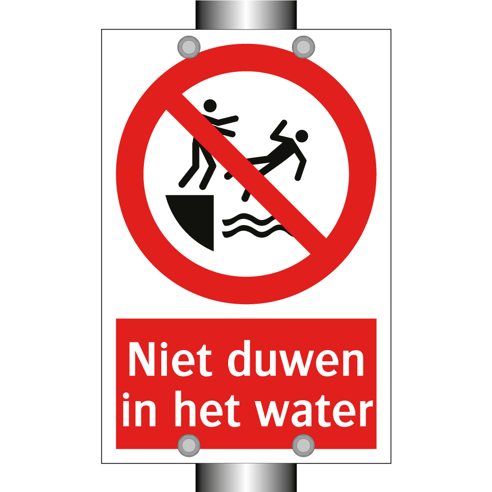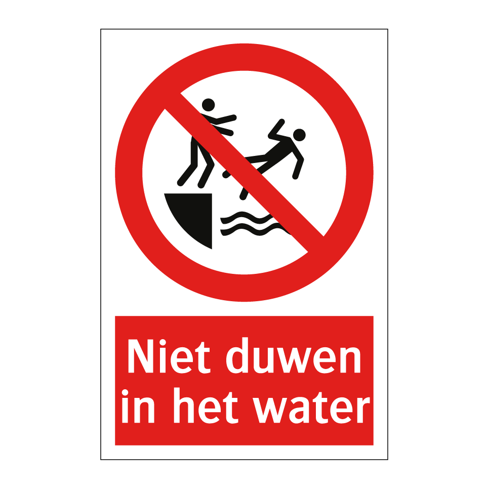 Deze opvallende verbodsbord is essentieel voor het waarborgen van de veiligheid in en rondom watergebieden. Het bord, met zijn rode achtergrond en witte tekst, waarschuwt duidelijk tegen het gevaar van duwen in het water. Ideaal voor gebruik bij zwembaden, meren, vijvers en andere waterlocaties waar toezicht en veiligheid prioriteit zijn. Door de heldere symboliek en duidelijke boodschap is het bord gemakkelijk te begrijpen voor iedereen, ongeacht de taalbarrière. Plaats het op strategische plekken zoals ingangen, langs de waterkant of bij zwemplatforms om ongewenst gedrag te voorkomen en de veiligheid van alle bezoekers te garanderen.