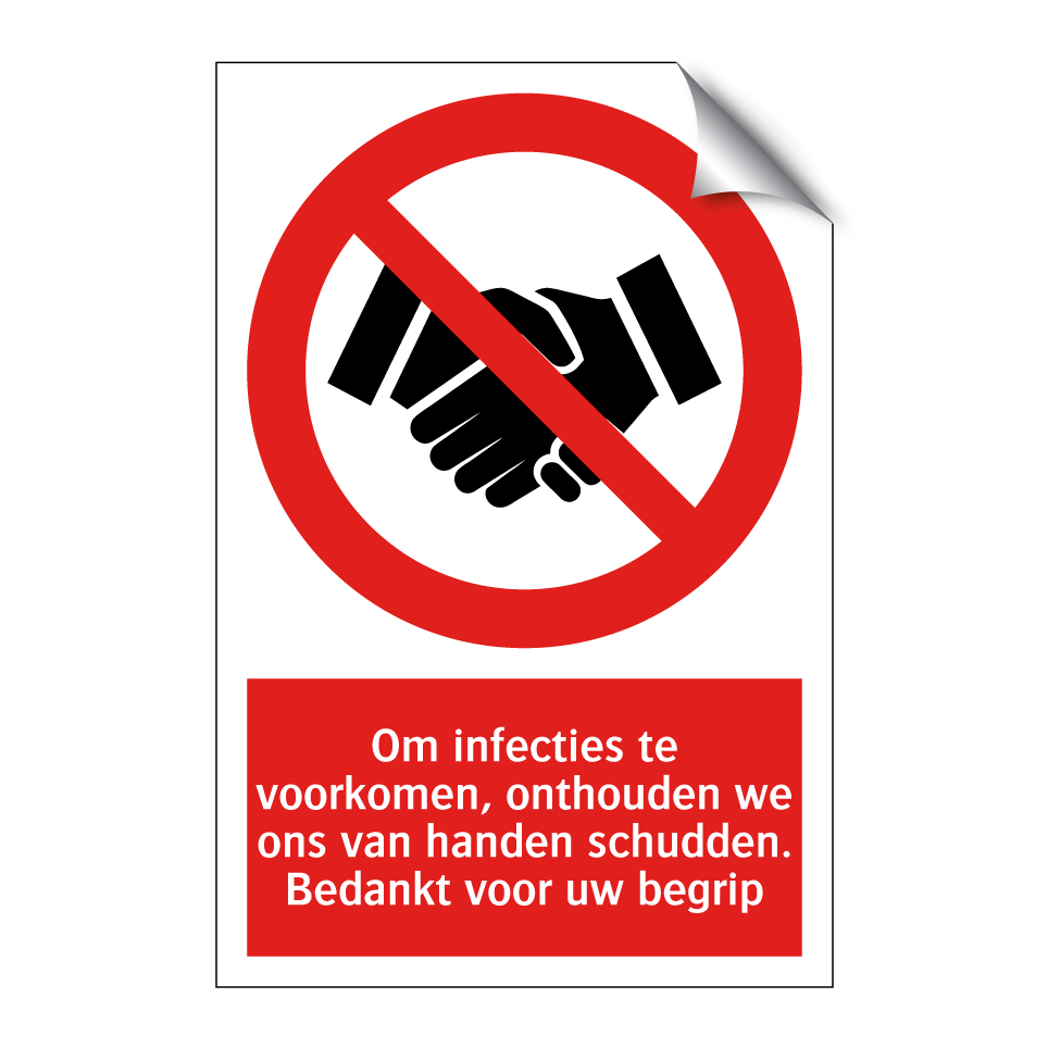 Verbodsbord met de tekst Om infecties te voorkomen, onthouden we ons van handen schudden. Bedankt voor uw begrip