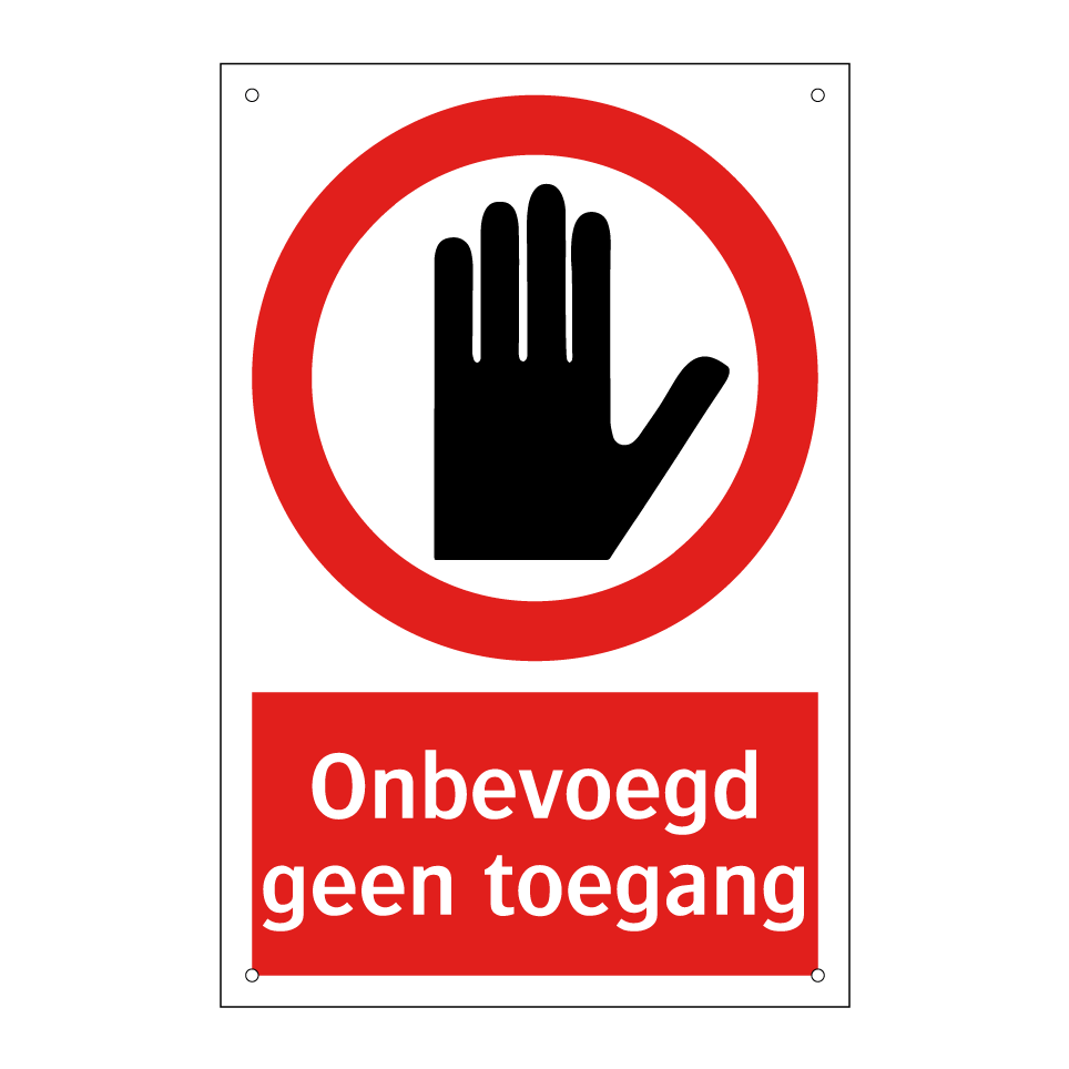 Deze opvallende verbodsbord is essentieel voor het waarborgen van de veiligheid en het handhaven van de orde op uw terrein. Met zijn duidelijke rode achtergrond en witte tekst, gecombineerd met een herkenbaar symbool, communiceert het bord effectief dat onbevoegden geen toegang hebben. Ideaal voor gebruik bij ingangen van privéterreinen, industriële zones, en andere gebieden waar toegang beperkt moet worden. Dit bord kan strategisch worden geplaatst bij poorten, deuren of hekken om ongewenste bezoekers af te schrikken en de veiligheid van uw eigendom te waarborgen. Zorg ervoor dat uw boodschap duidelijk en zichtbaar is met dit essentiële waarschuwingsbord.