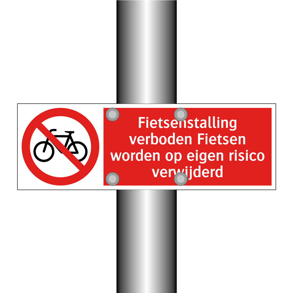 Verbodsbord met de tekst Fietsenstalling verboden Fietsen worden op eigen risico verwijderd